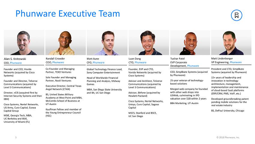 Global investor and customer base provides unmatched distribution for Phunware’s platform Top - Tier Investors and Customers © 2018 Phunware, Inc. Investors Indicative Customers by Industry 4 Real Estate Gaming Healthcare Retail Aviation Sports Media & Ent. 6 Financing Rounds Raised >$100 million