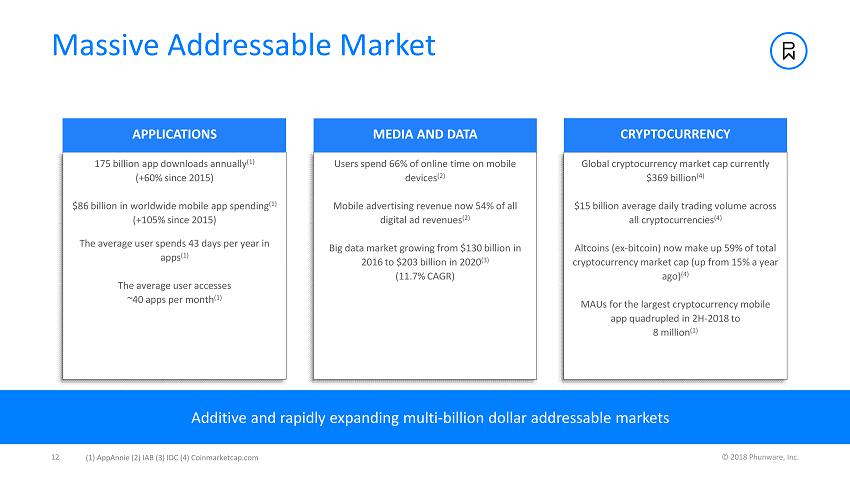 Transformational Market Opportunity 11 ▪ The Internet is undergoing a transformational wave driven by rapid data decentralization ▪ The way data is gathered, stored, and shared is changing as consumers and marketers become more wary of walled gardens ▪ Consumers are seeking self - sovereignty , or control over how their data is shared and monetized ▪ Phunware intends to leverage its place at the intersection of mobile cloud software, media, data and cryptocurrency to empower the consumer and dominate the Decentralized Computing Era COMPUTING POWER TIME PC Era Client / Server Era Internet Era Social / Mobile Era 1980 1990 2000 2010 2020 © 2018 Phunware, Inc. PhunCoin Decentralized Era closed ecosystems open ecosystems