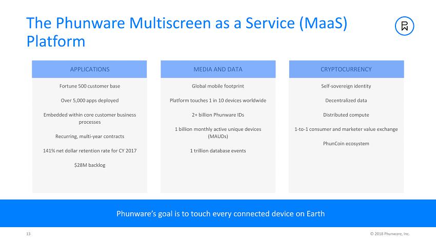 Users spend 66% of online time on mobile devices (2) Mobile advertising revenue now 54% of all digital ad revenues (2) Big data market growing from $130 billion in 2016 to $203 billion in 2020 (3) (11.7% CAGR) 175 billion app downloads annually (1) (+60% since 2015) $86 billion in worldwide mobile app spending (1) (+105% since 2015) The average user spends 43 days per year in apps (1) The average user accesses ~40 apps per month (1) Global cryptocurrency market cap currently $369 billion (4) $15 billion average daily trading volume across all cryptocurrencies (4) Altcoins (ex - bitcoin) now make up 59% of total cryptocurrency market cap (up from 15% a year ago) (4) MAUs for the largest cryptocurrency mobile app quadrupled in 2H - 2018 to 8 million (1) CRYPTOCURRENCY MEDIA AND DATA Massive Addressable Market 12 © 2018 Phunware, Inc. Additive and rapidly expanding multi - billion dollar addressable markets (1) AppAnnie (2) IAB (3) IDC (4) Coinmarketcap.com APPLICATIONS