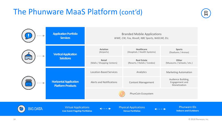 MEDIA AND DATA Global mobile footprint Platform touches 1 in 10 devices worldwide 2+ billion Phunware IDs 1 billion monthly active unique devices (MAUDs) 1 trillion database events APPLICATIONS Fortune 500 customer base Over 5,000 apps deployed Embedded within core customer business processes Recurring, multi - year contracts 141% net dollar retention rate for CY 2017 $28M backlog CRYPTOCURRENCY Self - sovereign identity Decentralized data Distributed compute 1 - to - 1 consumer and marketer value exchange PhunCoin ecosystem The Phunware Multiscreen as a Service (MaaS) Platform © 2018 Phunware, Inc. 13 Phunware’s goal is to touch every connected device on Earth