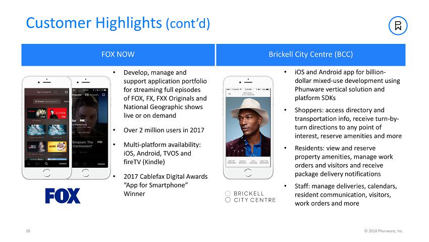 Customer Highlights 17 © 2018 Phunware, Inc. • Develop, manage and support streaming capabilities for 500+ hours of live Olympics content (vs. 200 across all TV networks) • First mobile application to include Nielsen tags • Over 7 million iOS and 2.5 million Android users during the event • Downtime of less than 0.01% achieved for entire duration of coverage • Set record for largest live event mobile viewing audience (2+ million) at the time • Phunware vertical solution application uses Wi - Fi and beacons to help patients, visitors, employees, physicians and volunteers navigate hospital facilities • Provides directions within the hospital, physician and department information and an up - to - date news feed • Deploying across all 39 facilities of this nationwide hospital system Dignity Health Compass NBC Live: Olympic Games