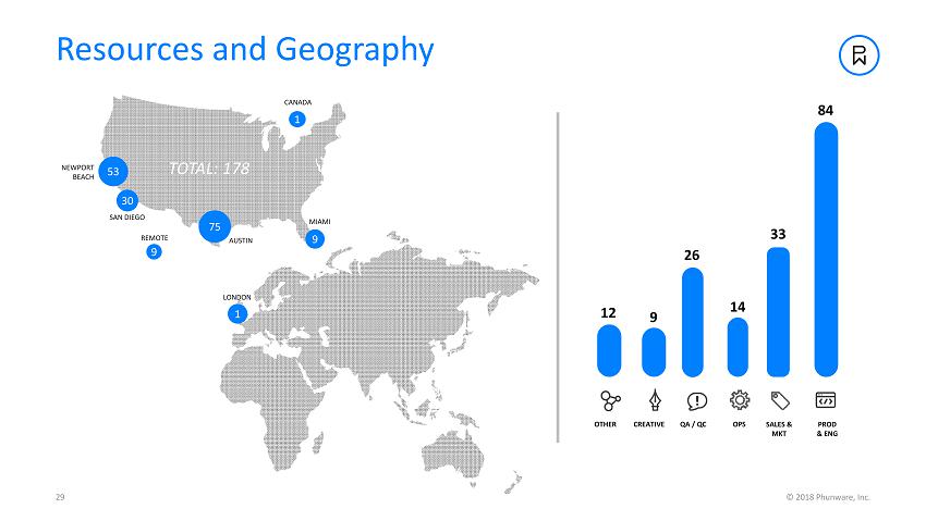 Resources and Geography AUSTIN MIAMI CANADA REMOTE SAN DIEGO NEWPORT BEACH 75 1 9 30 53 9 1 LONDON CREATIVE QA / QC OTHER PROD & ENG SALES & MKT OPS TOTAL: 178 29 12 33 84 14 26 9 © 2018 Phunware, Inc.