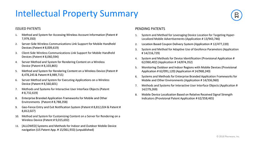Intellectual Property Summary © 2018 Phunware, Inc. ISSUED PATENTS 1. Method and System for Accessing Wireless Account Information (Patent # 7,979,350) 2. Server - Side Wireless Communications Link Support for Mobile Handheld Devices (Patent # 8,009,619) 3. Client - Side Wireless Communications Link Support for Mobile Handheld Devices (Patent # 8,060,594) 4. Server Method and System for Rendering Content on a Wireless Device (Patent # 8,103,865) 5. Method and System for Rendering Content on a Wireless Device (Patent # 8,478,245 & Patent # 8,989,715) 6. Server Method and System for Executing Applications on a Wireless Device (Patent # 8,560,601) 7. Methods and Systems for Interactive User Interface Objects (Patent # 8,732,619) 8. Enterprise Branded Application Frameworks for Mobile and Other Environments (Patent # 8,788,358) 9. Geo - Fence Entry and Exit Notification System (Patent # 8,812,024 & Patent # 8,812,027) 10. Method and System for Customizing Content on a Server for Rendering on a Wireless Device (Patent # 9,015,692) 11. [ALLOWED] Systems and Methods for Indoor and Outdoor Mobile Device navigation (US Patent App. # 15/061,933) (unpublished) PENDING PATENTS 1. System and Method for Leveraging Device Location for Targeting Hyper - Localized Mobile Advertisements (Application # 13/943,746) 2. Location Based Coupon Delivery System (Application # 12/477,220) 3. System and Method for Adaptive Use of Geofence Parameters (Application # 14/216,729) 4. System and Methods for Device Identification (Provisional Application # 62/060,402) (Application # 14/874,352) 5. Monitoring Outdoor and Indoor Regions with Mobile Devices (Provisional Application # 62/091,120) (Application # 14/968,240) 6. Systems and Methods for Enterprise Branded Application Frameworks for Mobile and Other Environments (Application # 14/336,960) 7. Methods and Systems for Interactive User Interface Objects (Application # 14/279,269) 8. Mobile Device Localization Based on Relative Received Signal Strength Indicators (Provisional Patent Application # 62/358,465)
