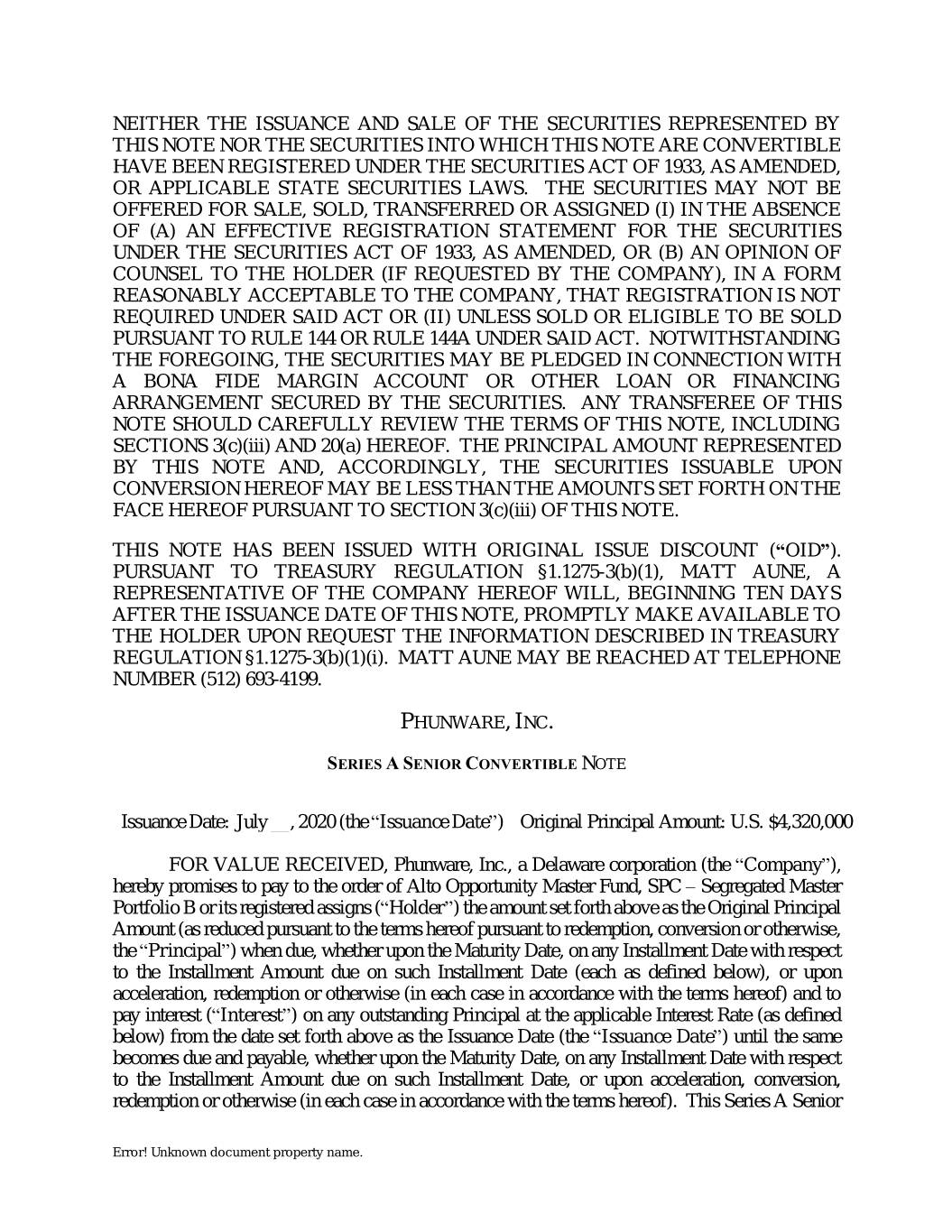 NEITHER THE ISSUANCE AND SALE OF THE SECURITIES REPRESENTED BY THIS NOTE NOR THE SECURITIES INTO WHICH THIS NOTE ARE CONVERTIBLE HAVE BEEN REGISTERED UNDER THE SECURITIES ACT OF 1933, AS AMENDED, OR APPLICABLE STATE SECURITIES LAWS. THE SECURITIES MAY NOT BE OFFERED FOR SALE, SOLD, TRANSFERRED OR ASSIGNED (I) IN THE ABSENCE OF (A) AN EFFECTIVE REGISTRATION STATEMENT FOR THE SECURITIES UNDER THE SECURITIES ACT OF 1933, AS AMENDED, OR (B) AN OPINION OF COUNSEL TO THE HOLDER (IF REQUESTED BY THE COMPANY), IN A FORM REASONABLY ACCEPTABLE TO THE COMPANY, THAT REGISTRATION IS NOT REQUIRED UNDER SAID ACT OR (II) UNLESS SOLD OR ELIGIBLE TO BE SOLD PURSUANT TO RULE 144 OR RULE 144A UNDER SAID ACT. NOTWITHSTANDING THE FOREGOING, THE SECURITIES MAY BE PLEDGED IN CONNECTION WITH A BONA FIDE MARGIN ACCOUNT OR OTHER LOAN OR FINANCING ARRANGEMENT SECURED BY THE SECURITIES. ANY TRANSFEREE OF THIS NOTE SHOULD CAREFULLY REVIEW THE TERMS OF THIS NOTE, INCLUDING SECTIONS 3(c)(iii) AND 20(a) HEREOF. THE PRINCIPAL AMOUNT REPRESENTED BY THIS NOTE AND, ACCORDINGLY, THE SECURITIES ISSUABLE UPON CONVERSION HEREOF MAY BE LESS THAN THE AMOUNTS SET FORTH ON THE FACE HEREOF PURSUANT TO SECTION 3(c)(iii) OF THIS NOTE. THIS NOTE HAS BEEN ISSUED WITH ORIGINAL ISSUE DISCOUNT (“OID”). PURSUANT TO TREASURY REGULATION §1.1275-3(b)(1), MATT AUNE, A REPRESENTATIVE OF THE COMPANY HEREOF WILL, BEGINNING TEN DAYS AFTER THE ISSUANCE DATE OF THIS NOTE, PROMPTLY MAKE AVAILABLE TO THE HOLDER UPON REQUEST THE INFORMATION DESCRIBED IN TREASURY REGULATION §1.1275-3(b)(1)(i). MATT AUNE MAY BE REACHED AT TELEPHONE NUMBER (512) 693-4199. PHUNWARE, INC. SERIES A SENIOR CONVERTIBLE NOTE Issuance Date: July __, 2020 (the “Issuance Date”) Original Principal Amount: U.S. $4,320,000 FOR VALUE RECEIVED, Phunware, Inc., a Delaware corporation (the “Company”), hereby promises to pay to the order of Alto Opportunity Master Fund, SPC – Segregated Master Portfolio B or its registered assigns (“Holder”) the amount set forth above as the Original Principal Amount (as reduced pursuant to the terms hereof pursuant to redemption, conversion or otherwise, the “Principal”) when due, whether upon the Maturity Date, on any Installment Date with respect to the Installment Amount due on such Installment Date (each as defined below), or upon acceleration, redemption or otherwise (in each case in accordance with the terms hereof) and to pay interest (“Interest”) on any outstanding Principal at the applicable Interest Rate (as defined below) from the date set forth above as the Issuance Date (the “Issuance Date”) until the same becomes due and payable, whether upon the Maturity Date, on any Installment Date with respect to the Installment Amount due on such Installment Date, or upon acceleration, conversion, redemption or otherwise (in each case in accordance with the terms hereof). This Series A Senior Error! Unknown document property name.