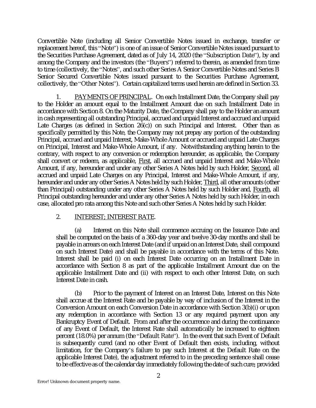 Convertible Note (including all Senior Convertible Notes issued in exchange, transfer or replacement hereof, this “Note”) is one of an issue of Senior Convertible Notes issued pursuant to the Securities Purchase Agreement, dated as of July 14, 2020 (the “Subscription Date”), by and among the Company and the investors (the “Buyers”) referred to therein, as amended from time to time (collectively, the “Notes”, and such other Series A Senior Convertible Notes and Series B Senior Secured Convertible Notes issued pursuant to the Securities Purchase Agreement, collectively, the “Other Notes”). Certain capitalized terms used herein are defined in Section 33. 1. PAYMENTS OF PRINCIPAL. On each Installment Date, the Company shall pay to the Holder an amount equal to the Installment Amount due on such Installment Date in accordance with Section 8. On the Maturity Date, the Company shall pay to the Holder an amount in cash representing all outstanding Principal, accrued and unpaid Interest and accrued and unpaid Late Charges (as defined in Section 26(c)) on such Principal and Interest. Other than as specifically permitted by this Note, the Company may not prepay any portion of the outstanding Principal, accrued and unpaid Interest, Make-Whole Amount or accrued and unpaid Late Charges on Principal, Interest and Make-Whole Amount, if any. Notwithstanding anything herein to the contrary, with respect to any conversion or redemption hereunder, as applicable, the Company shall convert or redeem, as applicable, First, all accrued and unpaid Interest and Make-Whole Amount, if any, hereunder and under any other Series A Notes held by such Holder, Second, all accrued and unpaid Late Charges on any Principal, Interest and Make-Whole Amount, if any, hereunder and under any other Series A Notes held by such Holder, Third, all other amounts (other than Principal) outstanding under any other Series A Notes held by such Holder and, Fourth, all Principal outstanding hereunder and under any other Series A Notes held by such Holder, in each case, allocated pro rata among this Note and such other Series A Notes held by such Holder. 2. INTEREST; INTEREST RATE. (a) Interest on this Note shall commence accruing on the Issuance Date and shall be computed on the basis of a 360-day year and twelve 30-day months and shall be payable in arrears on each Interest Date (and if unpaid on an Interest Date, shall compound on such Interest Date) and shall be payable in accordance with the terms of this Note. Interest shall be paid (i) on each Interest Date occurring on an Installment Date in accordance with Section 8 as part of the applicable Installment Amount due on the applicable Installment Date and (ii) with respect to each other Interest Date, on such Interest Date in cash. (b) Prior to the payment of Interest on an Interest Date, Interest on this Note shall accrue at the Interest Rate and be payable by way of inclusion of the Interest in the Conversion Amount on each Conversion Date in accordance with Section 3(b)(i) or upon any redemption in accordance with Section 13 or any required payment upon any Bankruptcy Event of Default. From and after the occurrence and during the continuance of any Event of Default, the Interest Rate shall automatically be increased to eighteen percent (18.0%) per annum (the “Default Rate”). In the event that such Event of Default is subsequently cured (and no other Event of Default then exists, including, without limitation, for the Company’s failure to pay such Interest at the Default Rate on the applicable Interest Date), the adjustment referred to in the preceding sentence shall cease to be effective as of the calendar day immediately following the date of such cure; provided 2 Error! Unknown document property name.