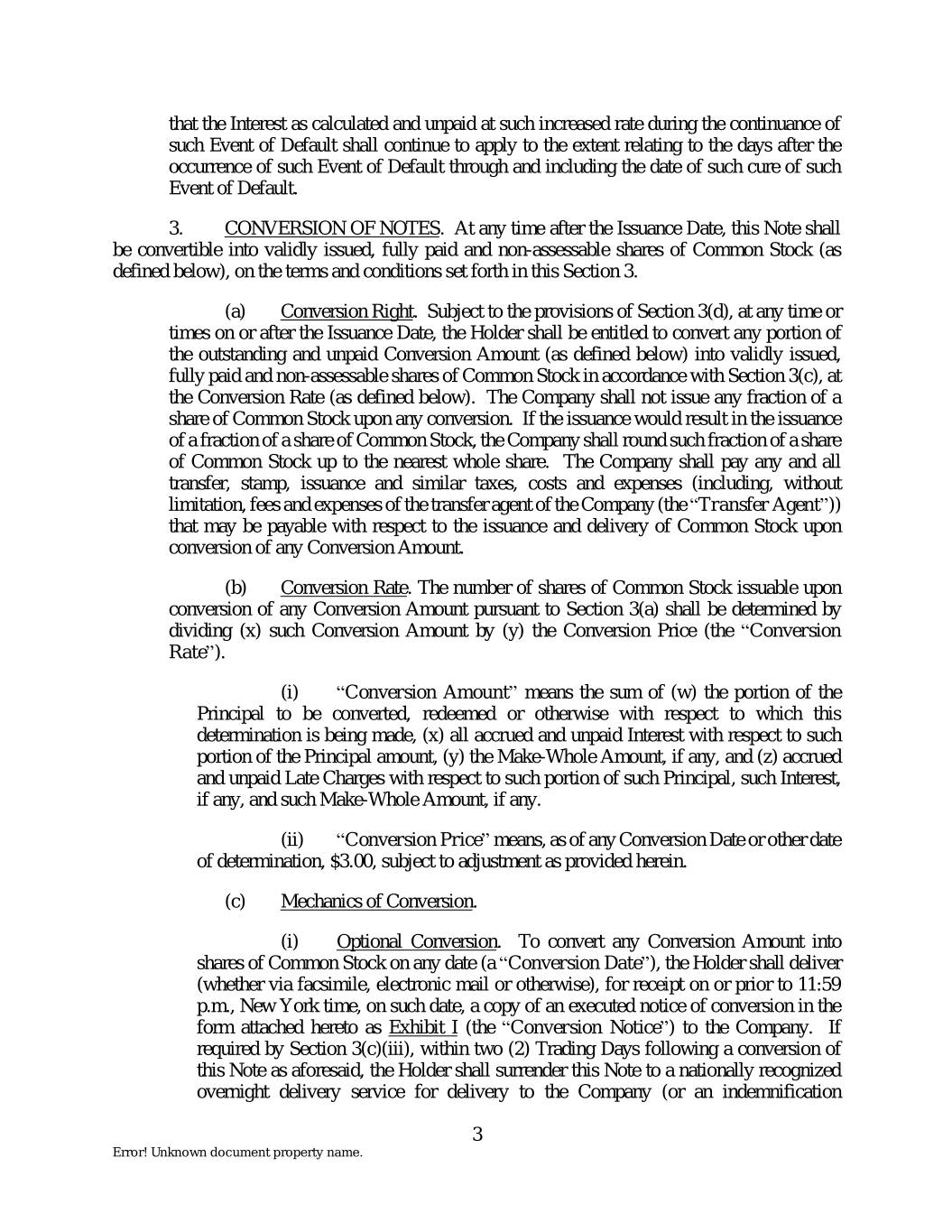 that the Interest as calculated and unpaid at such increased rate during the continuance of such Event of Default shall continue to apply to the extent relating to the days after the occurrence of such Event of Default through and including the date of such cure of such Event of Default. 3. CONVERSION OF NOTES. At any time after the Issuance Date, this Note shall be convertible into validly issued, fully paid and non-assessable shares of Common Stock (as defined below), on the terms and conditions set forth in this Section 3. (a) Conversion Right. Subject to the provisions of Section 3(d), at any time or times on or after the Issuance Date, the Holder shall be entitled to convert any portion of the outstanding and unpaid Conversion Amount (as defined below) into validly issued, fully paid and non-assessable shares of Common Stock in accordance with Section 3(c), at the Conversion Rate (as defined below). The Company shall not issue any fraction of a share of Common Stock upon any conversion. If the issuance would result in the issuance of a fraction of a share of Common Stock, the Company shall round such fraction of a share of Common Stock up to the nearest whole share. The Company shall pay any and all transfer, stamp, issuance and similar taxes, costs and expenses (including, without limitation, fees and expenses of the transfer agent of the Company (the “Transfer Agent”)) that may be payable with respect to the issuance and delivery of Common Stock upon conversion of any Conversion Amount. (b) Conversion Rate. The number of shares of Common Stock issuable upon conversion of any Conversion Amount pursuant to Section 3(a) shall be determined by dividing (x) such Conversion Amount by (y) the Conversion Price (the “Conversion Rate”). (i) “Conversion Amount” means the sum of (w) the portion of the Principal to be converted, redeemed or otherwise with respect to which this determination is being made, (x) all accrued and unpaid Interest with respect to such portion of the Principal amount, (y) the Make-Whole Amount, if any, and (z) accrued and unpaid Late Charges with respect to such portion of such Principal, such Interest, if any, and such Make-Whole Amount, if any. (ii) “Conversion Price” means, as of any Conversion Date or other date of determination, $3.00, subject to adjustment as provided herein. (c) Mechanics of Conversion. (i) Optional Conversion. To convert any Conversion Amount into shares of Common Stock on any date (a “Conversion Date”), the Holder shall deliver (whether via facsimile, electronic mail or otherwise), for receipt on or prior to 11:59 p.m., New York time, on such date, a copy of an executed notice of conversion in the form attached hereto as Exhibit I (the “Conversion Notice”) to the Company. If required by Section 3(c)(iii), within two (2) Trading Days following a conversion of this Note as aforesaid, the Holder shall surrender this Note to a nationally recognized overnight delivery service for delivery to the Company (or an indemnification 3 Error! Unknown document property name.