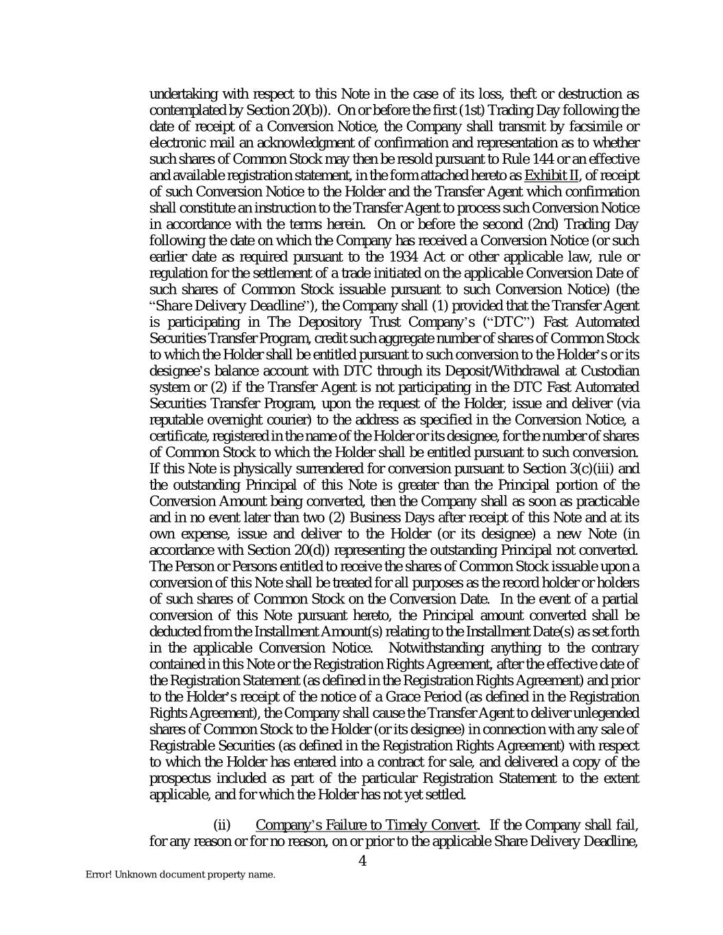 undertaking with respect to this Note in the case of its loss, theft or destruction as contemplated by Section 20(b)). On or before the first (1st) Trading Day following the date of receipt of a Conversion Notice, the Company shall transmit by facsimile or electronic mail an acknowledgment of confirmation and representation as to whether such shares of Common Stock may then be resold pursuant to Rule 144 or an effective and available registration statement, in the form attached hereto as Exhibit II, of receipt of such Conversion Notice to the Holder and the Transfer Agent which confirmation shall constitute an instruction to the Transfer Agent to process such Conversion Notice in accordance with the terms herein. On or before the second (2nd) Trading Day following the date on which the Company has received a Conversion Notice (or such earlier date as required pursuant to the 1934 Act or other applicable law, rule or regulation for the settlement of a trade initiated on the applicable Conversion Date of such shares of Common Stock issuable pursuant to such Conversion Notice) (the “Share Delivery Deadline”), the Company shall (1) provided that the Transfer Agent is participating in The Depository Trust Company’s (“DTC”) Fast Automated Securities Transfer Program, credit such aggregate number of shares of Common Stock to which the Holder shall be entitled pursuant to such conversion to the Holder’s or its designee’s balance account with DTC through its Deposit/Withdrawal at Custodian system or (2) if the Transfer Agent is not participating in the DTC Fast Automated Securities Transfer Program, upon the request of the Holder, issue and deliver (via reputable overnight courier) to the address as specified in the Conversion Notice, a certificate, registered in the name of the Holder or its designee, for the number of shares of Common Stock to which the Holder shall be entitled pursuant to such conversion. If this Note is physically surrendered for conversion pursuant to Section 3(c)(iii) and the outstanding Principal of this Note is greater than the Principal portion of the Conversion Amount being converted, then the Company shall as soon as practicable and in no event later than two (2) Business Days after receipt of this Note and at its own expense, issue and deliver to the Holder (or its designee) a new Note (in accordance with Section 20(d)) representing the outstanding Principal not converted. The Person or Persons entitled to receive the shares of Common Stock issuable upon a conversion of this Note shall be treated for all purposes as the record holder or holders of such shares of Common Stock on the Conversion Date. In the event of a partial conversion of this Note pursuant hereto, the Principal amount converted shall be deducted from the Installment Amount(s) relating to the Installment Date(s) as set forth in the applicable Conversion Notice. Notwithstanding anything to the contrary contained in this Note or the Registration Rights Agreement, after the effective date of the Registration Statement (as defined in the Registration Rights Agreement) and prior to the Holder’s receipt of the notice of a Grace Period (as defined in the Registration Rights Agreement), the Company shall cause the Transfer Agent to deliver unlegended shares of Common Stock to the Holder (or its designee) in connection with any sale of Registrable Securities (as defined in the Registration Rights Agreement) with respect to which the Holder has entered into a contract for sale, and delivered a copy of the prospectus included as part of the particular Registration Statement to the extent applicable, and for which the Holder has not yet settled. (ii) Company’s Failure to Timely Convert. If the Company shall fail, for any reason or for no reason, on or prior to the applicable Share Delivery Deadline, 4 Error! Unknown document property name.