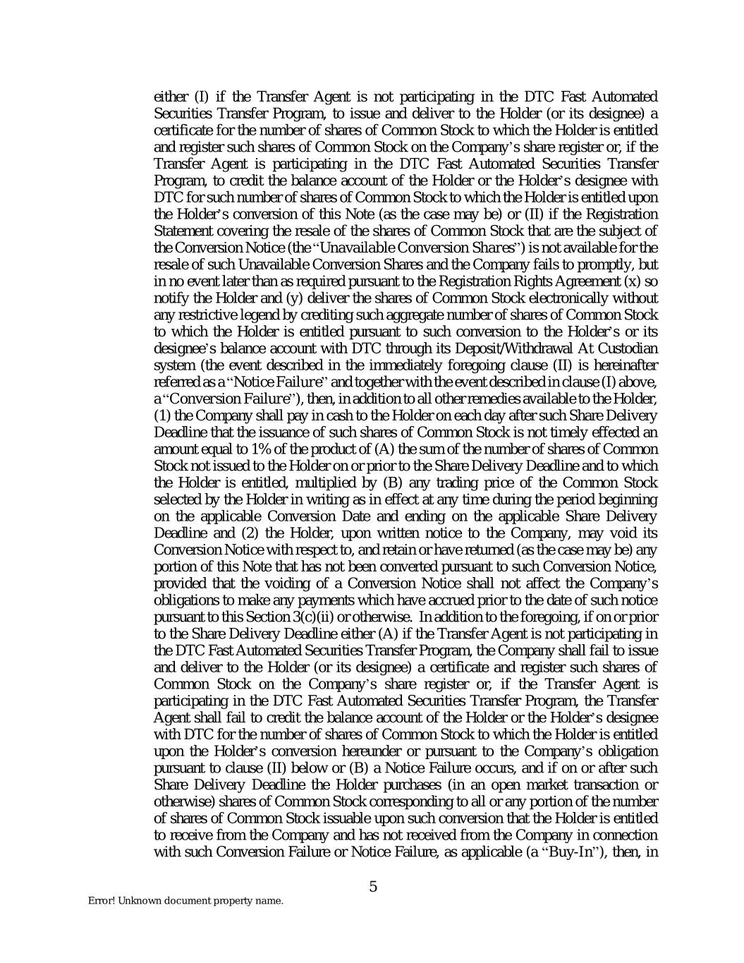 either (I) if the Transfer Agent is not participating in the DTC Fast Automated Securities Transfer Program, to issue and deliver to the Holder (or its designee) a certificate for the number of shares of Common Stock to which the Holder is entitled and register such shares of Common Stock on the Company’s share register or, if the Transfer Agent is participating in the DTC Fast Automated Securities Transfer Program, to credit the balance account of the Holder or the Holder’s designee with DTC for such number of shares of Common Stock to which the Holder is entitled upon the Holder’s conversion of this Note (as the case may be) or (II) if the Registration Statement covering the resale of the shares of Common Stock that are the subject of the Conversion Notice (the “Unavailable Conversion Shares”) is not available for the resale of such Unavailable Conversion Shares and the Company fails to promptly, but in no event later than as required pursuant to the Registration Rights Agreement (x) so notify the Holder and (y) deliver the shares of Common Stock electronically without any restrictive legend by crediting such aggregate number of shares of Common Stock to which the Holder is entitled pursuant to such conversion to the Holder’s or its designee’s balance account with DTC through its Deposit/Withdrawal At Custodian system (the event described in the immediately foregoing clause (II) is hereinafter referred as a “Notice Failure” and together with the event described in clause (I) above, a “Conversion Failure”), then, in addition to all other remedies available to the Holder, (1) the Company shall pay in cash to the Holder on each day after such Share Delivery Deadline that the issuance of such shares of Common Stock is not timely effected an amount equal to 1% of the product of (A) the sum of the number of shares of Common Stock not issued to the Holder on or prior to the Share Delivery Deadline and to which the Holder is entitled, multiplied by (B) any trading price of the Common Stock selected by the Holder in writing as in effect at any time during the period beginning on the applicable Conversion Date and ending on the applicable Share Delivery Deadline and (2) the Holder, upon written notice to the Company, may void its Conversion Notice with respect to, and retain or have returned (as the case may be) any portion of this Note that has not been converted pursuant to such Conversion Notice, provided that the voiding of a Conversion Notice shall not affect the Company’s obligations to make any payments which have accrued prior to the date of such notice pursuant to this Section 3(c)(ii) or otherwise. In addition to the foregoing, if on or prior to the Share Delivery Deadline either (A) if the Transfer Agent is not participating in the DTC Fast Automated Securities Transfer Program, the Company shall fail to issue and deliver to the Holder (or its designee) a certificate and register such shares of Common Stock on the Company’s share register or, if the Transfer Agent is participating in the DTC Fast Automated Securities Transfer Program, the Transfer Agent shall fail to credit the balance account of the Holder or the Holder’s designee with DTC for the number of shares of Common Stock to which the Holder is entitled upon the Holder’s conversion hereunder or pursuant to the Company’s obligation pursuant to clause (II) below or (B) a Notice Failure occurs, and if on or after such Share Delivery Deadline the Holder purchases (in an open market transaction or otherwise) shares of Common Stock corresponding to all or any portion of the number of shares of Common Stock issuable upon such conversion that the Holder is entitled to receive from the Company and has not received from the Company in connection with such Conversion Failure or Notice Failure, as applicable (a “Buy-In”), then, in 5 Error! Unknown document property name.