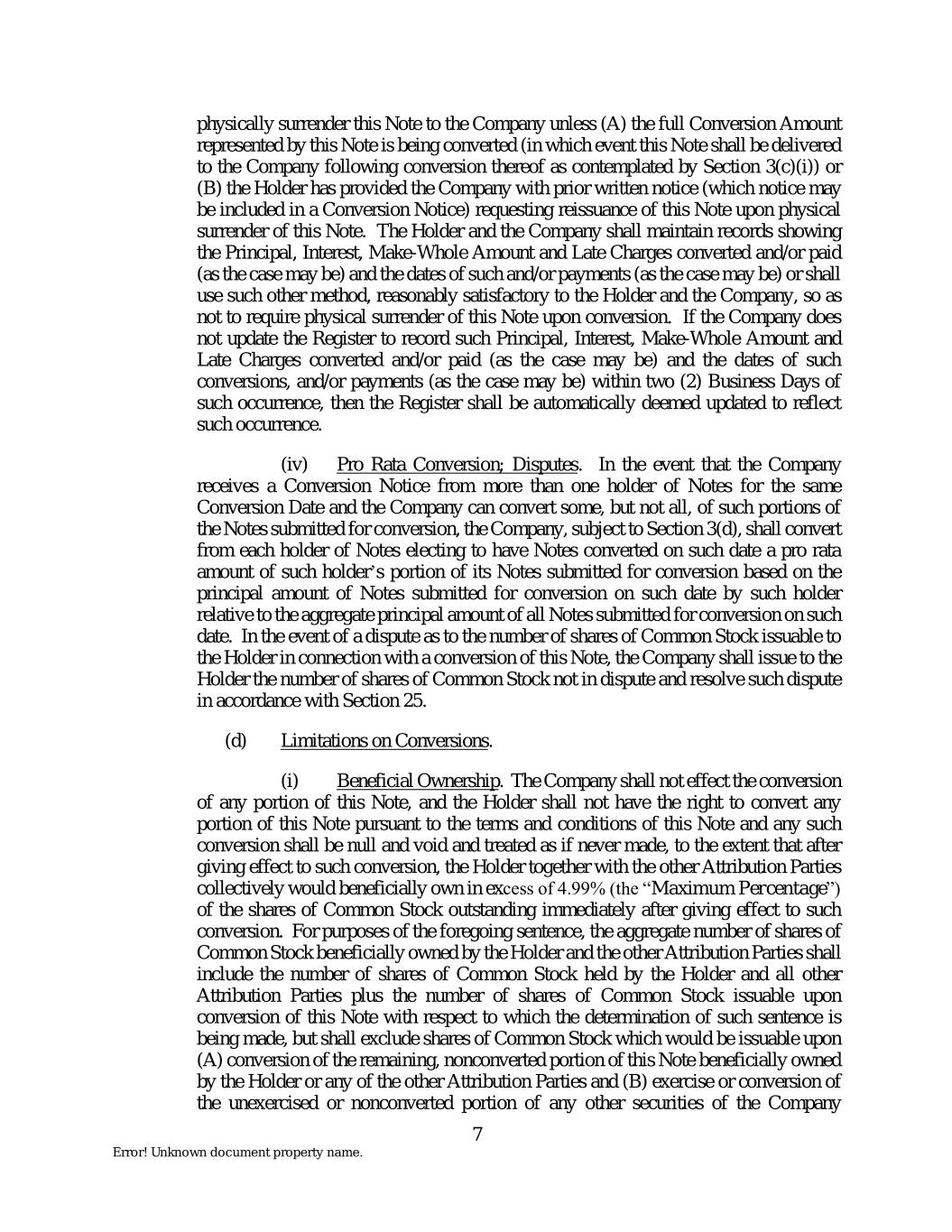 physically surrender this Note to the Company unless (A) the full Conversion Amount represented by this Note is being converted (in which event this Note shall be delivered to the Company following conversion thereof as contemplated by Section 3(c)(i)) or (B) the Holder has provided the Company with prior written notice (which notice may be included in a Conversion Notice) requesting reissuance of this Note upon physical surrender of this Note. The Holder and the Company shall maintain records showing the Principal, Interest, Make-Whole Amount and Late Charges converted and/or paid (as the case may be) and the dates of such and/or payments (as the case may be) or shall use such other method, reasonably satisfactory to the Holder and the Company, so as not to require physical surrender of this Note upon conversion. If the Company does not update the Register to record such Principal, Interest, Make-Whole Amount and Late Charges converted and/or paid (as the case may be) and the dates of such conversions, and/or payments (as the case may be) within two (2) Business Days of such occurrence, then the Register shall be automatically deemed updated to reflect such occurrence. (iv) Pro Rata Conversion; Disputes. In the event that the Company receives a Conversion Notice from more than one holder of Notes for the same Conversion Date and the Company can convert some, but not all, of such portions of the Notes submitted for conversion, the Company, subject to Section 3(d), shall convert from each holder of Notes electing to have Notes converted on such date a pro rata amount of such holder’s portion of its Notes submitted for conversion based on the principal amount of Notes submitted for conversion on such date by such holder relative to the aggregate principal amount of all Notes submitted for conversion on such date. In the event of a dispute as to the number of shares of Common Stock issuable to the Holder in connection with a conversion of this Note, the Company shall issue to the Holder the number of shares of Common Stock not in dispute and resolve such dispute in accordance with Section 25. (d) Limitations on Conversions. (i) Beneficial Ownership. The Company shall not effect the conversion of any portion of this Note, and the Holder shall not have the right to convert any portion of this Note pursuant to the terms and conditions of this Note and any such conversion shall be null and void and treated as if never made, to the extent that after giving effect to such conversion, the Holder together with the other Attribution Parties collectively would beneficially own in excess of 4.99% (the “Maximum Percentage”) of the shares of Common Stock outstanding immediately after giving effect to such conversion. For purposes of the foregoing sentence, the aggregate number of shares of Common Stock beneficially owned by the Holder and the other Attribution Parties shall include the number of shares of Common Stock held by the Holder and all other Attribution Parties plus the number of shares of Common Stock issuable upon conversion of this Note with respect to which the determination of such sentence is being made, but shall exclude shares of Common Stock which would be issuable upon (A) conversion of the remaining, nonconverted portion of this Note beneficially owned by the Holder or any of the other Attribution Parties and (B) exercise or conversion of the unexercised or nonconverted portion of any other securities of the Company 7 Error! Unknown document property name.