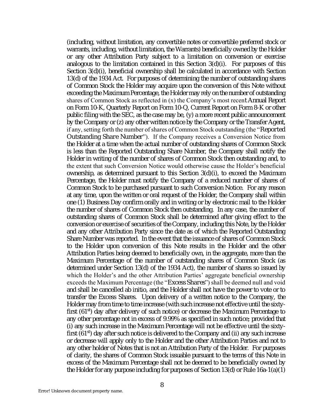 (including, without limitation, any convertible notes or convertible preferred stock or warrants, including, without limitation, the Warrants) beneficially owned by the Holder or any other Attribution Party subject to a limitation on conversion or exercise analogous to the limitation contained in this Section 3(d)(i). For purposes of this Section 3(d)(i), beneficial ownership shall be calculated in accordance with Section 13(d) of the 1934 Act. For purposes of determining the number of outstanding shares of Common Stock the Holder may acquire upon the conversion of this Note without exceeding the Maximum Percentage, the Holder may rely on the number of outstanding shares of Common Stock as reflected in (x) the Company’s most recent Annual Report on Form 10-K, Quarterly Report on Form 10-Q, Current Report on Form 8-K or other public filing with the SEC, as the case may be, (y) a more recent public announcement by the Company or (z) any other written notice by the Company or the Transfer Agent, if any, setting forth the number of shares of Common Stock outstanding (the “Reported Outstanding Share Number”). If the Company receives a Conversion Notice from the Holder at a time when the actual number of outstanding shares of Common Stock is less than the Reported Outstanding Share Number, the Company shall notify the Holder in writing of the number of shares of Common Stock then outstanding and, to the extent that such Conversion Notice would otherwise cause the Holder’s beneficial ownership, as determined pursuant to this Section 3(d)(i), to exceed the Maximum Percentage, the Holder must notify the Company of a reduced number of shares of Common Stock to be purchased pursuant to such Conversion Notice. For any reason at any time, upon the written or oral request of the Holder, the Company shall within one (1) Business Day confirm orally and in writing or by electronic mail to the Holder the number of shares of Common Stock then outstanding. In any case, the number of outstanding shares of Common Stock shall be determined after giving effect to the conversion or exercise of securities of the Company, including this Note, by the Holder and any other Attribution Party since the date as of which the Reported Outstanding Share Number was reported. In the event that the issuance of shares of Common Stock to the Holder upon conversion of this Note results in the Holder and the other Attribution Parties being deemed to beneficially own, in the aggregate, more than the Maximum Percentage of the number of outstanding shares of Common Stock (as determined under Section 13(d) of the 1934 Act), the number of shares so issued by which the Holder’s and the other Attribution Parties’ aggregate beneficial ownership exceeds the Maximum Percentage (the “Excess Shares”) shall be deemed null and void and shall be cancelled ab initio, and the Holder shall not have the power to vote or to transfer the Excess Shares. Upon delivery of a written notice to the Company, the Holder may from time to time increase (with such increase not effective until the sixty- first (61st) day after delivery of such notice) or decrease the Maximum Percentage to any other percentage not in excess of 9.99% as specified in such notice; provided that (i) any such increase in the Maximum Percentage will not be effective until the sixty- first (61st) day after such notice is delivered to the Company and (ii) any such increase or decrease will apply only to the Holder and the other Attribution Parties and not to any other holder of Notes that is not an Attribution Party of the Holder. For purposes of clarity, the shares of Common Stock issuable pursuant to the terms of this Note in excess of the Maximum Percentage shall not be deemed to be beneficially owned by the Holder for any purpose including for purposes of Section 13(d) or Rule 16a-1(a)(1) 8 Error! Unknown document property name.