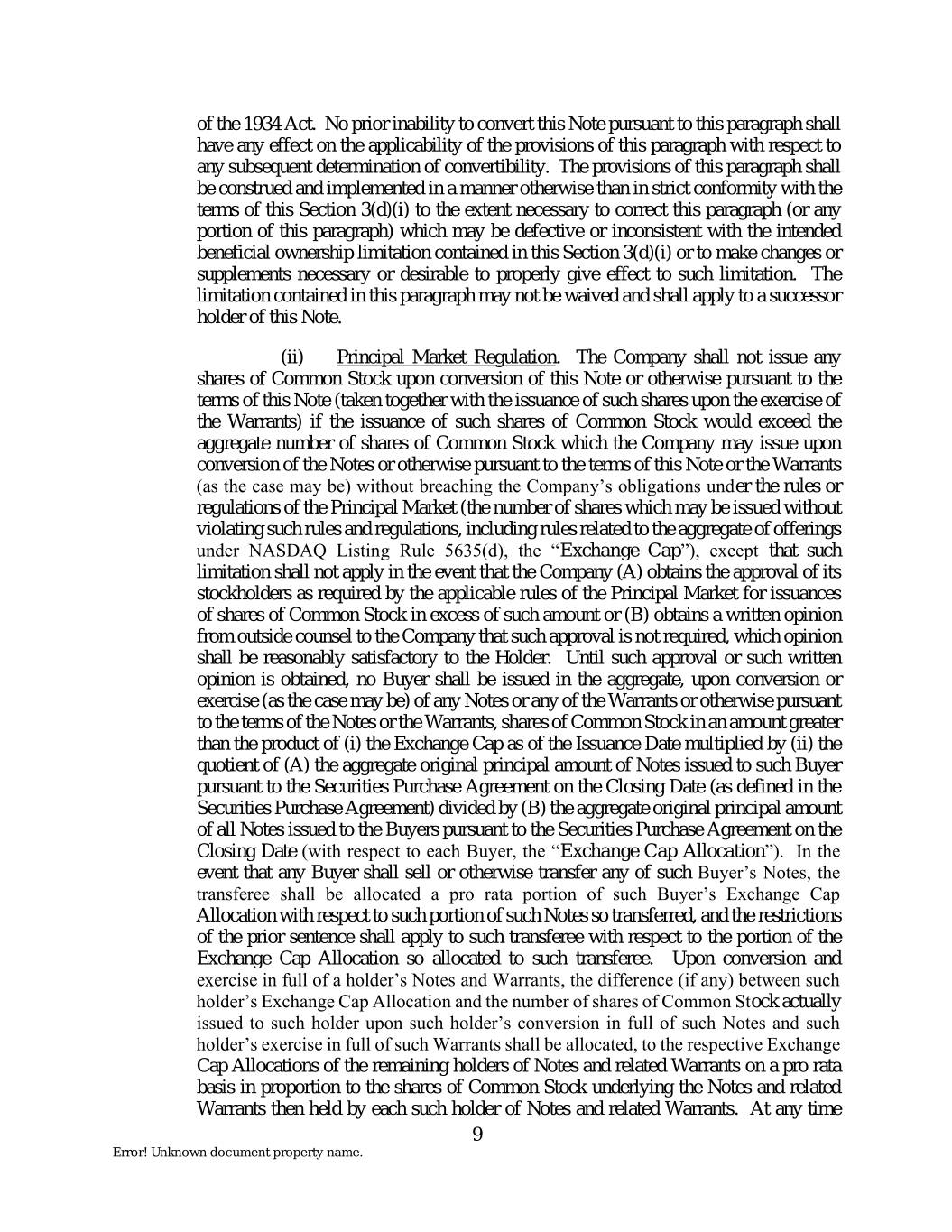 of the 1934 Act. No prior inability to convert this Note pursuant to this paragraph shall have any effect on the applicability of the provisions of this paragraph with respect to any subsequent determination of convertibility. The provisions of this paragraph shall be construed and implemented in a manner otherwise than in strict conformity with the terms of this Section 3(d)(i) to the extent necessary to correct this paragraph (or any portion of this paragraph) which may be defective or inconsistent with the intended beneficial ownership limitation contained in this Section 3(d)(i) or to make changes or supplements necessary or desirable to properly give effect to such limitation. The limitation contained in this paragraph may not be waived and shall apply to a successor holder of this Note. (ii) Principal Market Regulation. The Company shall not issue any shares of Common Stock upon conversion of this Note or otherwise pursuant to the terms of this Note (taken together with the issuance of such shares upon the exercise of the Warrants) if the issuance of such shares of Common Stock would exceed the aggregate number of shares of Common Stock which the Company may issue upon conversion of the Notes or otherwise pursuant to the terms of this Note or the Warrants (as the case may be) without breaching the Company’s obligations under the rules or regulations of the Principal Market (the number of shares which may be issued without violating such rules and regulations, including rules related to the aggregate of offerings under NASDAQ Listing Rule 5635(d), the “Exchange Cap”), except that such limitation shall not apply in the event that the Company (A) obtains the approval of its stockholders as required by the applicable rules of the Principal Market for issuances of shares of Common Stock in excess of such amount or (B) obtains a written opinion from outside counsel to the Company that such approval is not required, which opinion shall be reasonably satisfactory to the Holder. Until such approval or such written opinion is obtained, no Buyer shall be issued in the aggregate, upon conversion or exercise (as the case may be) of any Notes or any of the Warrants or otherwise pursuant to the terms of the Notes or the Warrants, shares of Common Stock in an amount greater than the product of (i) the Exchange Cap as of the Issuance Date multiplied by (ii) the quotient of (A) the aggregate original principal amount of Notes issued to such Buyer pursuant to the Securities Purchase Agreement on the Closing Date (as defined in the Securities Purchase Agreement) divided by (B) the aggregate original principal amount of all Notes issued to the Buyers pursuant to the Securities Purchase Agreement on the Closing Date (with respect to each Buyer, the “Exchange Cap Allocation”). In the event that any Buyer shall sell or otherwise transfer any of such Buyer’s Notes, the transferee shall be allocated a pro rata portion of such Buyer’s Exchange Cap Allocation with respect to such portion of such Notes so transferred, and the restrictions of the prior sentence shall apply to such transferee with respect to the portion of the Exchange Cap Allocation so allocated to such transferee. Upon conversion and exercise in full of a holder’s Notes and Warrants, the difference (if any) between such holder’s Exchange Cap Allocation and the number of shares of Common Stock actually issued to such holder upon such holder’s conversion in full of such Notes and such holder’s exercise in full of such Warrants shall be allocated, to the respective Exchange Cap Allocations of the remaining holders of Notes and related Warrants on a pro rata basis in proportion to the shares of Common Stock underlying the Notes and related Warrants then held by each such holder of Notes and related Warrants. At any time 9 Error! Unknown document property name.