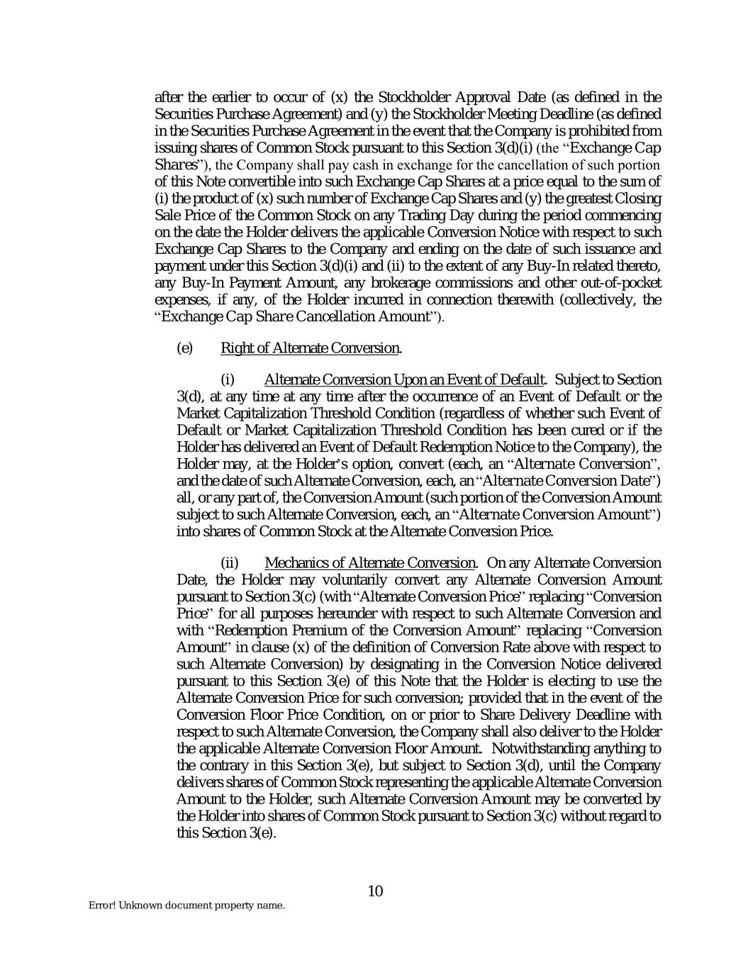 after the earlier to occur of (x) the Stockholder Approval Date (as defined in the Securities Purchase Agreement) and (y) the Stockholder Meeting Deadline (as defined in the Securities Purchase Agreement in the event that the Company is prohibited from issuing shares of Common Stock pursuant to this Section 3(d)(i) (the “Exchange Cap Shares”), the Company shall pay cash in exchange for the cancellation of such portion of this Note convertible into such Exchange Cap Shares at a price equal to the sum of (i) the product of (x) such number of Exchange Cap Shares and (y) the greatest Closing Sale Price of the Common Stock on any Trading Day during the period commencing on the date the Holder delivers the applicable Conversion Notice with respect to such Exchange Cap Shares to the Company and ending on the date of such issuance and payment under this Section 3(d)(i) and (ii) to the extent of any Buy-In related thereto, any Buy-In Payment Amount, any brokerage commissions and other out-of-pocket expenses, if any, of the Holder incurred in connection therewith (collectively, the “Exchange Cap Share Cancellation Amount”). (e) Right of Alternate Conversion. (i) Alternate Conversion Upon an Event of Default. Subject to Section 3(d), at any time at any time after the occurrence of an Event of Default or the Market Capitalization Threshold Condition (regardless of whether such Event of Default or Market Capitalization Threshold Condition has been cured or if the Holder has delivered an Event of Default Redemption Notice to the Company), the Holder may, at the Holder’s option, convert (each, an “Alternate Conversion”, and the date of such Alternate Conversion, each, an “Alternate Conversion Date”) all, or any part of, the Conversion Amount (such portion of the Conversion Amount subject to such Alternate Conversion, each, an “Alternate Conversion Amount”) into shares of Common Stock at the Alternate Conversion Price. (ii) Mechanics of Alternate Conversion. On any Alternate Conversion Date, the Holder may voluntarily convert any Alternate Conversion Amount pursuant to Section 3(c) (with “Alternate Conversion Price” replacing “Conversion Price” for all purposes hereunder with respect to such Alternate Conversion and with “Redemption Premium of the Conversion Amount” replacing “Conversion Amount” in clause (x) of the definition of Conversion Rate above with respect to such Alternate Conversion) by designating in the Conversion Notice delivered pursuant to this Section 3(e) of this Note that the Holder is electing to use the Alternate Conversion Price for such conversion; provided that in the event of the Conversion Floor Price Condition, on or prior to Share Delivery Deadline with respect to such Alternate Conversion, the Company shall also deliver to the Holder the applicable Alternate Conversion Floor Amount. Notwithstanding anything to the contrary in this Section 3(e), but subject to Section 3(d), until the Company delivers shares of Common Stock representing the applicable Alternate Conversion Amount to the Holder, such Alternate Conversion Amount may be converted by the Holder into shares of Common Stock pursuant to Section 3(c) without regard to this Section 3(e). 10 Error! Unknown document property name.