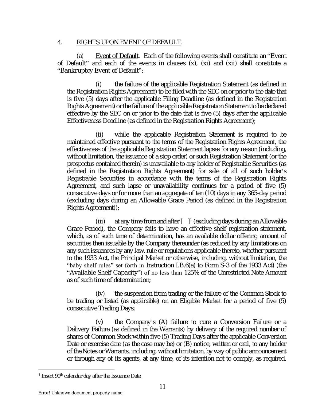 4. RIGHTS UPON EVENT OF DEFAULT. (a) Event of Default. Each of the following events shall constitute an “Event of Default” and each of the events in clauses (x), (xi) and (xii) shall constitute a “Bankruptcy Event of Default”: (i) the failure of the applicable Registration Statement (as defined in the Registration Rights Agreement) to be filed with the SEC on or prior to the date that is five (5) days after the applicable Filing Deadline (as defined in the Registration Rights Agreement) or the failure of the applicable Registration Statement to be declared effective by the SEC on or prior to the date that is five (5) days after the applicable Effectiveness Deadline (as defined in the Registration Rights Agreement); (ii) while the applicable Registration Statement is required to be maintained effective pursuant to the terms of the Registration Rights Agreement, the effectiveness of the applicable Registration Statement lapses for any reason (including, without limitation, the issuance of a stop order) or such Registration Statement (or the prospectus contained therein) is unavailable to any holder of Registrable Securities (as defined in the Registration Rights Agreement) for sale of all of such holder’s Registrable Securities in accordance with the terms of the Registration Rights Agreement, and such lapse or unavailability continues for a period of five (5) consecutive days or for more than an aggregate of ten (10) days in any 365-day period (excluding days during an Allowable Grace Period (as defined in the Registration Rights Agreement)); (iii) at any time from and after [ ]1 (excluding days during an Allowable Grace Period), the Company fails to have an effective shelf registration statement, which, as of such time of determination, has an available dollar offering amount of securities then issuable by the Company thereunder (as reduced by any limitations on any such issuances by any law, rule or regulations applicable thereto, whether pursuant to the 1933 Act, the Principal Market or otherwise, including, without limitation, the “baby shelf rules” set forth in Instruction I.B.6(a) to Form S-3 of the 1933 Act) (the “Available Shelf Capacity”) of no less than 125% of the Unrestricted Note Amount as of such time of determination; (iv) the suspension from trading or the failure of the Common Stock to be trading or listed (as applicable) on an Eligible Market for a period of five (5) consecutive Trading Days; (v) the Company’s (A) failure to cure a Conversion Failure or a Delivery Failure (as defined in the Warrants) by delivery of the required number of shares of Common Stock within five (5) Trading Days after the applicable Conversion Date or exercise date (as the case may be) or (B) notice, written or oral, to any holder of the Notes or Warrants, including, without limitation, by way of public announcement or through any of its agents, at any time, of its intention not to comply, as required, 1 Insert 90th calendar day after the Issuance Date 11 Error! Unknown document property name.