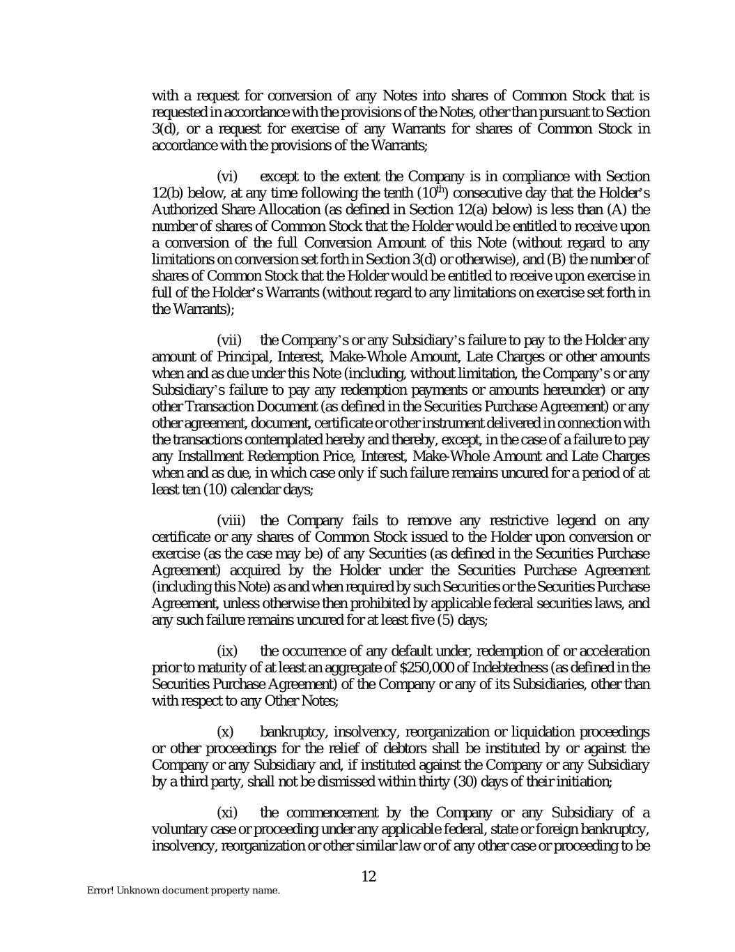 with a request for conversion of any Notes into shares of Common Stock that is requested in accordance with the provisions of the Notes, other than pursuant to Section 3(d), or a request for exercise of any Warrants for shares of Common Stock in accordance with the provisions of the Warrants; (vi) except to the extent the Company is in compliance with Section 12(b) below, at any time following the tenth (10th) consecutive day that the Holder’s Authorized Share Allocation (as defined in Section 12(a) below) is less than (A) the number of shares of Common Stock that the Holder would be entitled to receive upon a conversion of the full Conversion Amount of this Note (without regard to any limitations on conversion set forth in Section 3(d) or otherwise), and (B) the number of shares of Common Stock that the Holder would be entitled to receive upon exercise in full of the Holder’s Warrants (without regard to any limitations on exercise set forth in the Warrants); (vii) the Company’s or any Subsidiary’s failure to pay to the Holder any amount of Principal, Interest, Make-Whole Amount, Late Charges or other amounts when and as due under this Note (including, without limitation, the Company’s or any Subsidiary’s failure to pay any redemption payments or amounts hereunder) or any other Transaction Document (as defined in the Securities Purchase Agreement) or any other agreement, document, certificate or other instrument delivered in connection with the transactions contemplated hereby and thereby, except, in the case of a failure to pay any Installment Redemption Price, Interest, Make-Whole Amount and Late Charges when and as due, in which case only if such failure remains uncured for a period of at least ten (10) calendar days; (viii) the Company fails to remove any restrictive legend on any certificate or any shares of Common Stock issued to the Holder upon conversion or exercise (as the case may be) of any Securities (as defined in the Securities Purchase Agreement) acquired by the Holder under the Securities Purchase Agreement (including this Note) as and when required by such Securities or the Securities Purchase Agreement, unless otherwise then prohibited by applicable federal securities laws, and any such failure remains uncured for at least five (5) days; (ix) the occurrence of any default under, redemption of or acceleration prior to maturity of at least an aggregate of $250,000 of Indebtedness (as defined in the Securities Purchase Agreement) of the Company or any of its Subsidiaries, other than with respect to any Other Notes; (x) bankruptcy, insolvency, reorganization or liquidation proceedings or other proceedings for the relief of debtors shall be instituted by or against the Company or any Subsidiary and, if instituted against the Company or any Subsidiary by a third party, shall not be dismissed within thirty (30) days of their initiation; (xi) the commencement by the Company or any Subsidiary of a voluntary case or proceeding under any applicable federal, state or foreign bankruptcy, insolvency, reorganization or other similar law or of any other case or proceeding to be 12 Error! Unknown document property name.