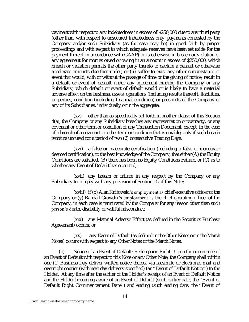 payment with respect to any Indebtedness in excess of $250,000 due to any third party (other than, with respect to unsecured Indebtedness only, payments contested by the Company and/or such Subsidiary (as the case may be) in good faith by proper proceedings and with respect to which adequate reserves have been set aside for the payment thereof in accordance with GAAP) or is otherwise in breach or violation of any agreement for monies owed or owing in an amount in excess of $250,000, which breach or violation permits the other party thereto to declare a default or otherwise accelerate amounts due thereunder, or (ii) suffer to exist any other circumstance or event that would, with or without the passage of time or the giving of notice, result in a default or event of default under any agreement binding the Company or any Subsidiary, which default or event of default would or is likely to have a material adverse effect on the business, assets, operations (including results thereof), liabilities, properties, condition (including financial condition) or prospects of the Company or any of its Subsidiaries, individually or in the aggregate; (xv) other than as specifically set forth in another clause of this Section 4(a), the Company or any Subsidiary breaches any representation or warranty, or any covenant or other term or condition of any Transaction Document, except, in the case of a breach of a covenant or other term or condition that is curable, only if such breach remains uncured for a period of two (2) consecutive Trading Days; (xvi) a false or inaccurate certification (including a false or inaccurate deemed certification), to the best knowledge of the Company, that either (A) the Equity Conditions are satisfied, (B) there has been no Equity Conditions Failure, or (C) as to whether any Event of Default has occurred; (xvii) any breach or failure in any respect by the Company or any Subsidiary to comply with any provision of Section 15 of this Note; (xviii) if (x) Alan Knitowski’s employment as chief executive officer of the Company or (y) Randall Crowder’s employment as the chief operating officer of the Company, in each case is terminated by the Company for any reason other than such person’s death, disability or willful misconduct; (xix) any Material Adverse Effect (as defined in the Securities Purchase Agreement) occurs; or (xx) any Event of Default (as defined in the Other Notes or in the March Notes) occurs with respect to any Other Notes or the March Notes. (b) Notice of an Event of Default; Redemption Right. Upon the occurrence of an Event of Default with respect to this Note or any Other Note, the Company shall within one (1) Business Day deliver written notice thereof via facsimile or electronic mail and overnight courier (with next day delivery specified) (an “Event of Default Notice”) to the Holder. At any time after the earlier of the Holder’s receipt of an Event of Default Notice and the Holder becoming aware of an Event of Default (such earlier date, the “Event of Default Right Commencement Date”) and ending (such ending date, the “Event of 14 Error! Unknown document property name.