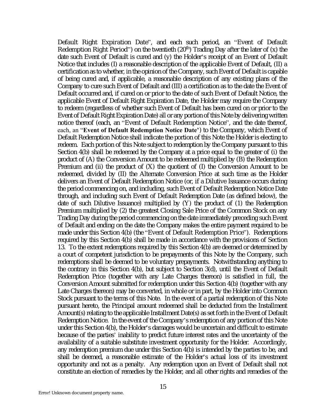 Default Right Expiration Date”, and each such period, an “Event of Default Redemption Right Period”) on the twentieth (20th) Trading Day after the later of (x) the date such Event of Default is cured and (y) the Holder’s receipt of an Event of Default Notice that includes (I) a reasonable description of the applicable Event of Default, (II) a certification as to whether, in the opinion of the Company, such Event of Default is capable of being cured and, if applicable, a reasonable description of any existing plans of the Company to cure such Event of Default and (III) a certification as to the date the Event of Default occurred and, if cured on or prior to the date of such Event of Default Notice, the applicable Event of Default Right Expiration Date, the Holder may require the Company to redeem (regardless of whether such Event of Default has been cured on or prior to the Event of Default Right Expiration Date) all or any portion of this Note by delivering written notice thereof (each, an “Event of Default Redemption Notice”, and the date thereof, each, an “Event of Default Redemption Notice Date’) to the Company, which Event of Default Redemption Notice shall indicate the portion of this Note the Holder is electing to redeem. Each portion of this Note subject to redemption by the Company pursuant to this Section 4(b) shall be redeemed by the Company at a price equal to the greater of (i) the product of (A) the Conversion Amount to be redeemed multiplied by (B) the Redemption Premium and (ii) the product of (X) the quotient of (I) the Conversion Amount to be redeemed, divided by (II) the Alternate Conversion Price at such time as the Holder delivers an Event of Default Redemption Notice (or, if a Dilutive Issuance occurs during the period commencing on, and including, such Event of Default Redemption Notice Date through, and including such Event of Default Redemption Date (as defined below), the date of such Dilutive Issuance) multiplied by (Y) the product of (1) the Redemption Premium multiplied by (2) the greatest Closing Sale Price of the Common Stock on any Trading Day during the period commencing on the date immediately preceding such Event of Default and ending on the date the Company makes the entire payment required to be made under this Section 4(b) (the “Event of Default Redemption Price”). Redemptions required by this Section 4(b) shall be made in accordance with the provisions of Section 13. To the extent redemptions required by this Section 4(b) are deemed or determined by a court of competent jurisdiction to be prepayments of this Note by the Company, such redemptions shall be deemed to be voluntary prepayments. Notwithstanding anything to the contrary in this Section 4(b), but subject to Section 3(d), until the Event of Default Redemption Price (together with any Late Charges thereon) is satisfied in full, the Conversion Amount submitted for redemption under this Section 4(b) (together with any Late Charges thereon) may be converted, in whole or in part, by the Holder into Common Stock pursuant to the terms of this Note. In the event of a partial redemption of this Note pursuant hereto, the Principal amount redeemed shall be deducted from the Installment Amount(s) relating to the applicable Installment Date(s) as set forth in the Event of Default Redemption Notice. In the event of the Company’s redemption of any portion of this Note under this Section 4(b), the Holder’s damages would be uncertain and difficult to estimate because of the parties’ inability to predict future interest rates and the uncertainty of the availability of a suitable substitute investment opportunity for the Holder. Accordingly, any redemption premium due under this Section 4(b) is intended by the parties to be, and shall be deemed, a reasonable estimate of the Holder’s actual loss of its investment opportunity and not as a penalty. Any redemption upon an Event of Default shall not constitute an election of remedies by the Holder, and all other rights and remedies of the 15 Error! Unknown document property name.