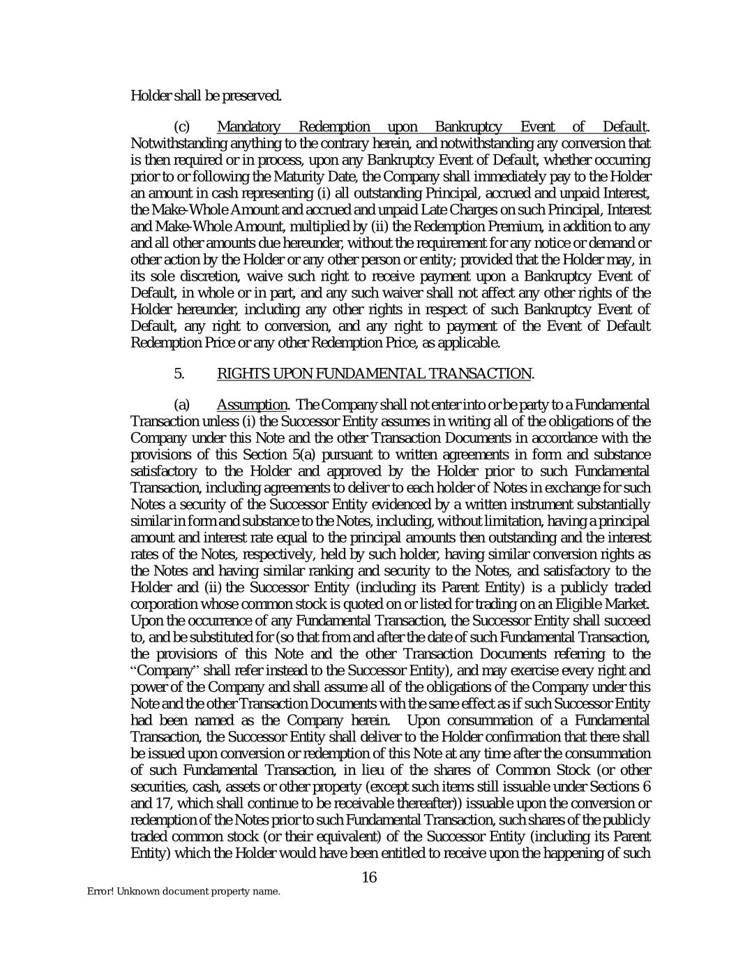 Holder shall be preserved. (c) Mandatory Redemption upon Bankruptcy Event of Default. Notwithstanding anything to the contrary herein, and notwithstanding any conversion that is then required or in process, upon any Bankruptcy Event of Default, whether occurring prior to or following the Maturity Date, the Company shall immediately pay to the Holder an amount in cash representing (i) all outstanding Principal, accrued and unpaid Interest, the Make-Whole Amount and accrued and unpaid Late Charges on such Principal, Interest and Make-Whole Amount, multiplied by (ii) the Redemption Premium, in addition to any and all other amounts due hereunder, without the requirement for any notice or demand or other action by the Holder or any other person or entity; provided that the Holder may, in its sole discretion, waive such right to receive payment upon a Bankruptcy Event of Default, in whole or in part, and any such waiver shall not affect any other rights of the Holder hereunder, including any other rights in respect of such Bankruptcy Event of Default, any right to conversion, and any right to payment of the Event of Default Redemption Price or any other Redemption Price, as applicable. 5. RIGHTS UPON FUNDAMENTAL TRANSACTION. (a) Assumption. The Company shall not enter into or be party to a Fundamental Transaction unless (i) the Successor Entity assumes in writing all of the obligations of the Company under this Note and the other Transaction Documents in accordance with the provisions of this Section 5(a) pursuant to written agreements in form and substance satisfactory to the Holder and approved by the Holder prior to such Fundamental Transaction, including agreements to deliver to each holder of Notes in exchange for such Notes a security of the Successor Entity evidenced by a written instrument substantially similar in form and substance to the Notes, including, without limitation, having a principal amount and interest rate equal to the principal amounts then outstanding and the interest rates of the Notes, respectively, held by such holder, having similar conversion rights as the Notes and having similar ranking and security to the Notes, and satisfactory to the Holder and (ii) the Successor Entity (including its Parent Entity) is a publicly traded corporation whose common stock is quoted on or listed for trading on an Eligible Market. Upon the occurrence of any Fundamental Transaction, the Successor Entity shall succeed to, and be substituted for (so that from and after the date of such Fundamental Transaction, the provisions of this Note and the other Transaction Documents referring to the “Company” shall refer instead to the Successor Entity), and may exercise every right and power of the Company and shall assume all of the obligations of the Company under this Note and the other Transaction Documents with the same effect as if such Successor Entity had been named as the Company herein. Upon consummation of a Fundamental Transaction, the Successor Entity shall deliver to the Holder confirmation that there shall be issued upon conversion or redemption of this Note at any time after the consummation of such Fundamental Transaction, in lieu of the shares of Common Stock (or other securities, cash, assets or other property (except such items still issuable under Sections 6 and 17, which shall continue to be receivable thereafter)) issuable upon the conversion or redemption of the Notes prior to such Fundamental Transaction, such shares of the publicly traded common stock (or their equivalent) of the Successor Entity (including its Parent Entity) which the Holder would have been entitled to receive upon the happening of such 16 Error! Unknown document property name.