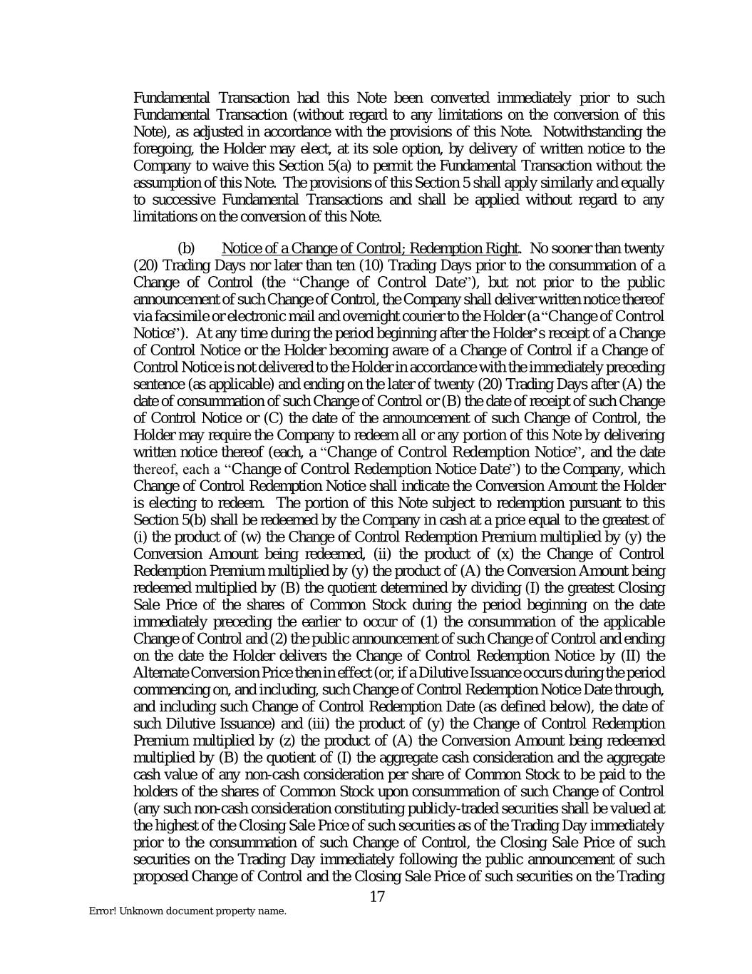 Fundamental Transaction had this Note been converted immediately prior to such Fundamental Transaction (without regard to any limitations on the conversion of this Note), as adjusted in accordance with the provisions of this Note. Notwithstanding the foregoing, the Holder may elect, at its sole option, by delivery of written notice to the Company to waive this Section 5(a) to permit the Fundamental Transaction without the assumption of this Note. The provisions of this Section 5 shall apply similarly and equally to successive Fundamental Transactions and shall be applied without regard to any limitations on the conversion of this Note. (b) Notice of a Change of Control; Redemption Right. No sooner than twenty (20) Trading Days nor later than ten (10) Trading Days prior to the consummation of a Change of Control (the “Change of Control Date”), but not prior to the public announcement of such Change of Control, the Company shall deliver written notice thereof via facsimile or electronic mail and overnight courier to the Holder (a “Change of Control Notice”). At any time during the period beginning after the Holder’s receipt of a Change of Control Notice or the Holder becoming aware of a Change of Control if a Change of Control Notice is not delivered to the Holder in accordance with the immediately preceding sentence (as applicable) and ending on the later of twenty (20) Trading Days after (A) the date of consummation of such Change of Control or (B) the date of receipt of such Change of Control Notice or (C) the date of the announcement of such Change of Control, the Holder may require the Company to redeem all or any portion of this Note by delivering written notice thereof (each, a “Change of Control Redemption Notice”, and the date thereof, each a “Change of Control Redemption Notice Date”) to the Company, which Change of Control Redemption Notice shall indicate the Conversion Amount the Holder is electing to redeem. The portion of this Note subject to redemption pursuant to this Section 5(b) shall be redeemed by the Company in cash at a price equal to the greatest of (i) the product of (w) the Change of Control Redemption Premium multiplied by (y) the Conversion Amount being redeemed, (ii) the product of (x) the Change of Control Redemption Premium multiplied by (y) the product of (A) the Conversion Amount being redeemed multiplied by (B) the quotient determined by dividing (I) the greatest Closing Sale Price of the shares of Common Stock during the period beginning on the date immediately preceding the earlier to occur of (1) the consummation of the applicable Change of Control and (2) the public announcement of such Change of Control and ending on the date the Holder delivers the Change of Control Redemption Notice by (II) the Alternate Conversion Price then in effect (or, if a Dilutive Issuance occurs during the period commencing on, and including, such Change of Control Redemption Notice Date through, and including such Change of Control Redemption Date (as defined below), the date of such Dilutive Issuance) and (iii) the product of (y) the Change of Control Redemption Premium multiplied by (z) the product of (A) the Conversion Amount being redeemed multiplied by (B) the quotient of (I) the aggregate cash consideration and the aggregate cash value of any non-cash consideration per share of Common Stock to be paid to the holders of the shares of Common Stock upon consummation of such Change of Control (any such non-cash consideration constituting publicly-traded securities shall be valued at the highest of the Closing Sale Price of such securities as of the Trading Day immediately prior to the consummation of such Change of Control, the Closing Sale Price of such securities on the Trading Day immediately following the public announcement of such proposed Change of Control and the Closing Sale Price of such securities on the Trading 17 Error! Unknown document property name.