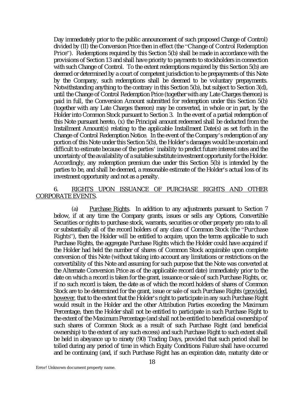 Day immediately prior to the public announcement of such proposed Change of Control) divided by (II) the Conversion Price then in effect (the “Change of Control Redemption Price”). Redemptions required by this Section 5(b) shall be made in accordance with the provisions of Section 13 and shall have priority to payments to stockholders in connection with such Change of Control. To the extent redemptions required by this Section 5(b) are deemed or determined by a court of competent jurisdiction to be prepayments of this Note by the Company, such redemptions shall be deemed to be voluntary prepayments. Notwithstanding anything to the contrary in this Section 5(b), but subject to Section 3(d), until the Change of Control Redemption Price (together with any Late Charges thereon) is paid in full, the Conversion Amount submitted for redemption under this Section 5(b) (together with any Late Charges thereon) may be converted, in whole or in part, by the Holder into Common Stock pursuant to Section 3. In the event of a partial redemption of this Note pursuant hereto, (x) the Principal amount redeemed shall be deducted from the Installment Amount(s) relating to the applicable Installment Date(s) as set forth in the Change of Control Redemption Notice. In the event of the Company’s redemption of any portion of this Note under this Section 5(b), the Holder’s damages would be uncertain and difficult to estimate because of the parties’ inability to predict future interest rates and the uncertainty of the availability of a suitable substitute investment opportunity for the Holder. Accordingly, any redemption premium due under this Section 5(b) is intended by the parties to be, and shall be deemed, a reasonable estimate of the Holder’s actual loss of its investment opportunity and not as a penalty. 6. RIGHTS UPON ISSUANCE OF PURCHASE RIGHTS AND OTHER CORPORATE EVENTS. (a) Purchase Rights. In addition to any adjustments pursuant to Section 7 below, if at any time the Company grants, issues or sells any Options, Convertible Securities or rights to purchase stock, warrants, securities or other property pro rata to all or substantially all of the record holders of any class of Common Stock (the “Purchase Rights”), then the Holder will be entitled to acquire, upon the terms applicable to such Purchase Rights, the aggregate Purchase Rights which the Holder could have acquired if the Holder had held the number of shares of Common Stock acquirable upon complete conversion of this Note (without taking into account any limitations or restrictions on the convertibility of this Note and assuming for such purpose that the Note was converted at the Alternate Conversion Price as of the applicable record date) immediately prior to the date on which a record is taken for the grant, issuance or sale of such Purchase Rights, or, if no such record is taken, the date as of which the record holders of shares of Common Stock are to be determined for the grant, issue or sale of such Purchase Rights (provided, however, that to the extent that the Holder’s right to participate in any such Purchase Right would result in the Holder and the other Attribution Parties exceeding the Maximum Percentage, then the Holder shall not be entitled to participate in such Purchase Right to the extent of the Maximum Percentage (and shall not be entitled to beneficial ownership of such shares of Common Stock as a result of such Purchase Right (and beneficial ownership) to the extent of any such excess) and such Purchase Right to such extent shall be held in abeyance up to ninety (90) Trading Days, provided that such period shall be tolled during any period of time in which Equity Conditions Failure shall have occurred and be continuing (and, if such Purchase Right has an expiration date, maturity date or 18 Error! Unknown document property name.