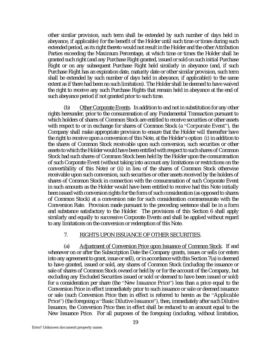 other similar provision, such term shall be extended by such number of days held in abeyance, if applicable) for the benefit of the Holder until such time or times during such extended period, as its right thereto would not result in the Holder and the other Attribution Parties exceeding the Maximum Percentage, at which time or times the Holder shall be granted such right (and any Purchase Right granted, issued or sold on such initial Purchase Right or on any subsequent Purchase Right held similarly in abeyance (and, if such Purchase Right has an expiration date, maturity date or other similar provision, such term shall be extended by such number of days held in abeyance, if applicable)) to the same extent as if there had been no such limitation). The Holder shall be deemed to have waived the right to receive any such Purchase Rights that remain held in abeyance at the end of such abeyance period if not granted prior to such time. (b) Other Corporate Events. In addition to and not in substitution for any other rights hereunder, prior to the consummation of any Fundamental Transaction pursuant to which holders of shares of Common Stock are entitled to receive securities or other assets with respect to or in exchange for shares of Common Stock (a “Corporate Event”), the Company shall make appropriate provision to ensure that the Holder will thereafter have the right to receive upon a conversion of this Note, at the Holder’s option (i) in addition to the shares of Common Stock receivable upon such conversion, such securities or other assets to which the Holder would have been entitled with respect to such shares of Common Stock had such shares of Common Stock been held by the Holder upon the consummation of such Corporate Event (without taking into account any limitations or restrictions on the convertibility of this Note) or (ii) in lieu of the shares of Common Stock otherwise receivable upon such conversion, such securities or other assets received by the holders of shares of Common Stock in connection with the consummation of such Corporate Event in such amounts as the Holder would have been entitled to receive had this Note initially been issued with conversion rights for the form of such consideration (as opposed to shares of Common Stock) at a conversion rate for such consideration commensurate with the Conversion Rate. Provision made pursuant to the preceding sentence shall be in a form and substance satisfactory to the Holder. The provisions of this Section 6 shall apply similarly and equally to successive Corporate Events and shall be applied without regard to any limitations on the conversion or redemption of this Note. 7. RIGHTS UPON ISSUANCE OF OTHER SECURITIES. (a) Adjustment of Conversion Price upon Issuance of Common Stock. If and whenever on or after the Subscription Date the Company grants, issues or sells (or enters into any agreement to grant, issue or sell), or in accordance with this Section 7(a) is deemed to have granted, issued or sold, any shares of Common Stock (including the issuance or sale of shares of Common Stock owned or held by or for the account of the Company, but excluding any Excluded Securities issued or sold or deemed to have been issued or sold) for a consideration per share (the “New Issuance Price”) less than a price equal to the Conversion Price in effect immediately prior to such issuance or sale or deemed issuance or sale (such Conversion Price then in effect is referred to herein as the “Applicable Price”) (the foregoing a “Basic Dilutive Issuance”), then, immediately after such Dilutive Issuance, the Conversion Price then in effect shall be reduced to an amount equal to the New Issuance Price. For all purposes of the foregoing (including, without limitation, 19 Error! Unknown document property name.