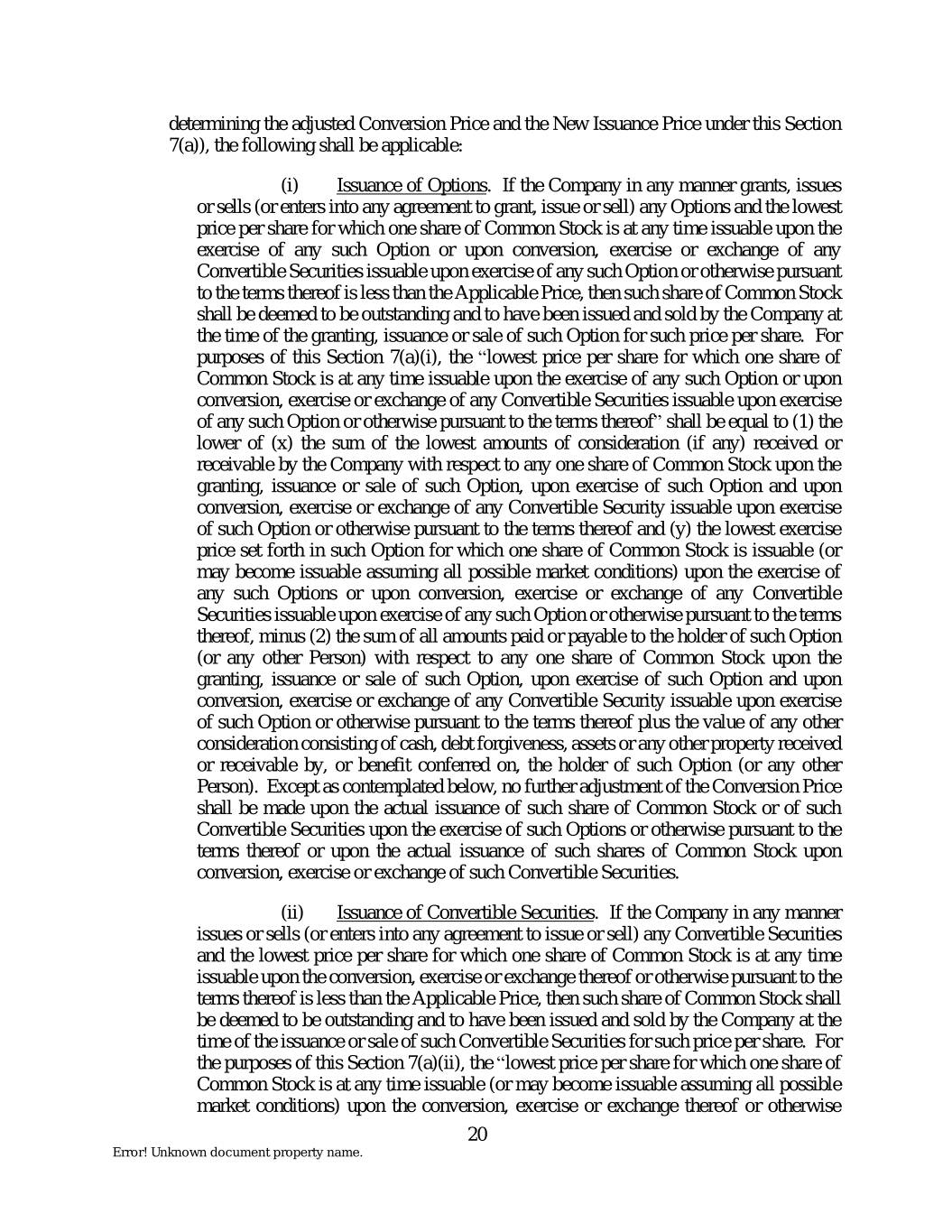 determining the adjusted Conversion Price and the New Issuance Price under this Section 7(a)), the following shall be applicable: (i) Issuance of Options. If the Company in any manner grants, issues or sells (or enters into any agreement to grant, issue or sell) any Options and the lowest price per share for which one share of Common Stock is at any time issuable upon the exercise of any such Option or upon conversion, exercise or exchange of any Convertible Securities issuable upon exercise of any such Option or otherwise pursuant to the terms thereof is less than the Applicable Price, then such share of Common Stock shall be deemed to be outstanding and to have been issued and sold by the Company at the time of the granting, issuance or sale of such Option for such price per share. For purposes of this Section 7(a)(i), the “lowest price per share for which one share of Common Stock is at any time issuable upon the exercise of any such Option or upon conversion, exercise or exchange of any Convertible Securities issuable upon exercise of any such Option or otherwise pursuant to the terms thereof” shall be equal to (1) the lower of (x) the sum of the lowest amounts of consideration (if any) received or receivable by the Company with respect to any one share of Common Stock upon the granting, issuance or sale of such Option, upon exercise of such Option and upon conversion, exercise or exchange of any Convertible Security issuable upon exercise of such Option or otherwise pursuant to the terms thereof and (y) the lowest exercise price set forth in such Option for which one share of Common Stock is issuable (or may become issuable assuming all possible market conditions) upon the exercise of any such Options or upon conversion, exercise or exchange of any Convertible Securities issuable upon exercise of any such Option or otherwise pursuant to the terms thereof, minus (2) the sum of all amounts paid or payable to the holder of such Option (or any other Person) with respect to any one share of Common Stock upon the granting, issuance or sale of such Option, upon exercise of such Option and upon conversion, exercise or exchange of any Convertible Security issuable upon exercise of such Option or otherwise pursuant to the terms thereof plus the value of any other consideration consisting of cash, debt forgiveness, assets or any other property received or receivable by, or benefit conferred on, the holder of such Option (or any other Person). Except as contemplated below, no further adjustment of the Conversion Price shall be made upon the actual issuance of such share of Common Stock or of such Convertible Securities upon the exercise of such Options or otherwise pursuant to the terms thereof or upon the actual issuance of such shares of Common Stock upon conversion, exercise or exchange of such Convertible Securities. (ii) Issuance of Convertible Securities. If the Company in any manner issues or sells (or enters into any agreement to issue or sell) any Convertible Securities and the lowest price per share for which one share of Common Stock is at any time issuable upon the conversion, exercise or exchange thereof or otherwise pursuant to the terms thereof is less than the Applicable Price, then such share of Common Stock shall be deemed to be outstanding and to have been issued and sold by the Company at the time of the issuance or sale of such Convertible Securities for such price per share. For the purposes of this Section 7(a)(ii), the “lowest price per share for which one share of Common Stock is at any time issuable (or may become issuable assuming all possible market conditions) upon the conversion, exercise or exchange thereof or otherwise 20 Error! Unknown document property name.