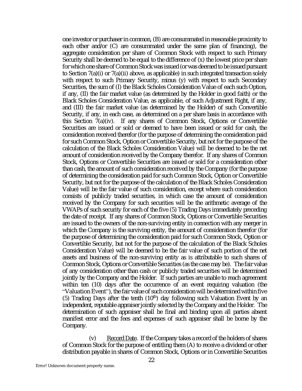 one investor or purchaser in common, (B) are consummated in reasonable proximity to each other and/or (C) are consummated under the same plan of financing), the aggregate consideration per share of Common Stock with respect to such Primary Security shall be deemed to be equal to the difference of (x) the lowest price per share for which one share of Common Stock was issued (or was deemed to be issued pursuant to Section 7(a)(i) or 7(a)(ii) above, as applicable) in such integrated transaction solely with respect to such Primary Security, minus (y) with respect to such Secondary Securities, the sum of (I) the Black Scholes Consideration Value of each such Option, if any, (II) the fair market value (as determined by the Holder in good faith) or the Black Scholes Consideration Value, as applicable, of such Adjustment Right, if any, and (III) the fair market value (as determined by the Holder) of such Convertible Security, if any, in each case, as determined on a per share basis in accordance with this Section 7(a)(iv). If any shares of Common Stock, Options or Convertible Securities are issued or sold or deemed to have been issued or sold for cash, the consideration received therefor (for the purpose of determining the consideration paid for such Common Stock, Option or Convertible Security, but not for the purpose of the calculation of the Black Scholes Consideration Value) will be deemed to be the net amount of consideration received by the Company therefor. If any shares of Common Stock, Options or Convertible Securities are issued or sold for a consideration other than cash, the amount of such consideration received by the Company (for the purpose of determining the consideration paid for such Common Stock, Option or Convertible Security, but not for the purpose of the calculation of the Black Scholes Consideration Value) will be the fair value of such consideration, except where such consideration consists of publicly traded securities, in which case the amount of consideration received by the Company for such securities will be the arithmetic average of the VWAPs of such security for each of the five (5) Trading Days immediately preceding the date of receipt. If any shares of Common Stock, Options or Convertible Securities are issued to the owners of the non-surviving entity in connection with any merger in which the Company is the surviving entity, the amount of consideration therefor (for the purpose of determining the consideration paid for such Common Stock, Option or Convertible Security, but not for the purpose of the calculation of the Black Scholes Consideration Value) will be deemed to be the fair value of such portion of the net assets and business of the non-surviving entity as is attributable to such shares of Common Stock, Options or Convertible Securities (as the case may be). The fair value of any consideration other than cash or publicly traded securities will be determined jointly by the Company and the Holder. If such parties are unable to reach agreement within ten (10) days after the occurrence of an event requiring valuation (the “Valuation Event”), the fair value of such consideration will be determined within five (5) Trading Days after the tenth (10th) day following such Valuation Event by an independent, reputable appraiser jointly selected by the Company and the Holder. The determination of such appraiser shall be final and binding upon all parties absent manifest error and the fees and expenses of such appraiser shall be borne by the Company. (v) Record Date. If the Company takes a record of the holders of shares of Common Stock for the purpose of entitling them (A) to receive a dividend or other distribution payable in shares of Common Stock, Options or in Convertible Securities 22 Error! Unknown document property name.
