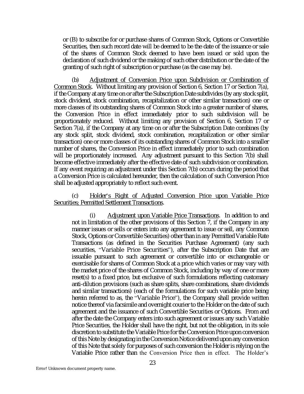 or (B) to subscribe for or purchase shares of Common Stock, Options or Convertible Securities, then such record date will be deemed to be the date of the issuance or sale of the shares of Common Stock deemed to have been issued or sold upon the declaration of such dividend or the making of such other distribution or the date of the granting of such right of subscription or purchase (as the case may be). (b) Adjustment of Conversion Price upon Subdivision or Combination of Common Stock. Without limiting any provision of Section 6, Section 17 or Section 7(a), if the Company at any time on or after the Subscription Date subdivides (by any stock split, stock dividend, stock combination, recapitalization or other similar transaction) one or more classes of its outstanding shares of Common Stock into a greater number of shares, the Conversion Price in effect immediately prior to such subdivision will be proportionately reduced. Without limiting any provision of Section 6, Section 17 or Section 7(a), if the Company at any time on or after the Subscription Date combines (by any stock split, stock dividend, stock combination, recapitalization or other similar transaction) one or more classes of its outstanding shares of Common Stock into a smaller number of shares, the Conversion Price in effect immediately prior to such combination will be proportionately increased. Any adjustment pursuant to this Section 7(b) shall become effective immediately after the effective date of such subdivision or combination. If any event requiring an adjustment under this Section 7(b) occurs during the period that a Conversion Price is calculated hereunder, then the calculation of such Conversion Price shall be adjusted appropriately to reflect such event. (c) Holder’s Right of Adjusted Conversion Price upon Variable Price Securities; Permitted Settlement Transactions. (i) Adjustment upon Variable Price Transactions. In addition to and not in limitation of the other provisions of this Section 7, if the Company in any manner issues or sells or enters into any agreement to issue or sell, any Common Stock, Options or Convertible Securities) other than in any Permitted Variable Rate Transactions (as defined in the Securities Purchase Agreement) (any such securities, “Variable Price Securities”), after the Subscription Date that are issuable pursuant to such agreement or convertible into or exchangeable or exercisable for shares of Common Stock at a price which varies or may vary with the market price of the shares of Common Stock, including by way of one or more reset(s) to a fixed price, but exclusive of such formulations reflecting customary anti-dilution provisions (such as share splits, share combinations, share dividends and similar transactions) (each of the formulations for such variable price being herein referred to as, the “Variable Price”), the Company shall provide written notice thereof via facsimile and overnight courier to the Holder on the date of such agreement and the issuance of such Convertible Securities or Options. From and after the date the Company enters into such agreement or issues any such Variable Price Securities, the Holder shall have the right, but not the obligation, in its sole discretion to substitute the Variable Price for the Conversion Price upon conversion of this Note by designating in the Conversion Notice delivered upon any conversion of this Note that solely for purposes of such conversion the Holder is relying on the Variable Price rather than the Conversion Price then in effect. The Holder’s 23 Error! Unknown document property name.