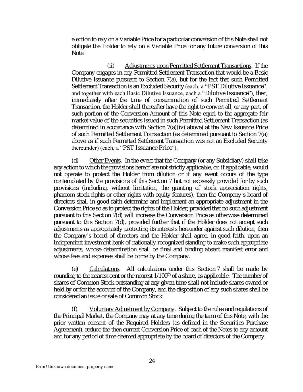 election to rely on a Variable Price for a particular conversion of this Note shall not obligate the Holder to rely on a Variable Price for any future conversion of this Note. (ii) Adjustments upon Permitted Settlement Transactions. If the Company engages in any Permitted Settlement Transaction that would be a Basic Dilutive Issuance pursuant to Section 7(a), but for the fact that such Permitted Settlement Transaction is an Excluded Security (each, a “PST Dilutive Issuance”, and together with each Basic Dilutive Issuance, each a “Dilutive Issuance”), then, immediately after the time of consummation of such Permitted Settlement Transaction, the Holder shall thereafter have the right to convert all, or any part, of such portion of the Conversion Amount of this Note equal to the aggregate fair market value of the securities issued in such Permitted Settlement Transaction (as determined in accordance with Section 7(a)(iv) above) at the New Issuance Price of such Permitted Settlement Transaction (as determined pursuant to Section 7(a) above as if such Permitted Settlement Transaction was not an Excluded Security thereunder) (each, a “PST Issuance Price”). (d) Other Events. In the event that the Company (or any Subsidiary) shall take any action to which the provisions hereof are not strictly applicable, or, if applicable, would not operate to protect the Holder from dilution or if any event occurs of the type contemplated by the provisions of this Section 7 but not expressly provided for by such provisions (including, without limitation, the granting of stock appreciation rights, phantom stock rights or other rights with equity features), then the Company’s board of directors shall in good faith determine and implement an appropriate adjustment in the Conversion Price so as to protect the rights of the Holder, provided that no such adjustment pursuant to this Section 7(d) will increase the Conversion Price as otherwise determined pursuant to this Section 7(d), provided further that if the Holder does not accept such adjustments as appropriately protecting its interests hereunder against such dilution, then the Company’s board of directors and the Holder shall agree, in good faith, upon an independent investment bank of nationally recognized standing to make such appropriate adjustments, whose determination shall be final and binding absent manifest error and whose fees and expenses shall be borne by the Company. (e) Calculations. All calculations under this Section 7 shall be made by rounding to the nearest cent or the nearest 1/100th of a share, as applicable. The number of shares of Common Stock outstanding at any given time shall not include shares owned or held by or for the account of the Company, and the disposition of any such shares shall be considered an issue or sale of Common Stock. (f) Voluntary Adjustment by Company. Subject to the rules and regulations of the Principal Market, the Company may at any time during the term of this Note, with the prior written consent of the Required Holders (as defined in the Securities Purchase Agreement), reduce the then current Conversion Price of each of the Notes to any amount and for any period of time deemed appropriate by the board of directors of the Company. 24 Error! Unknown document property name.