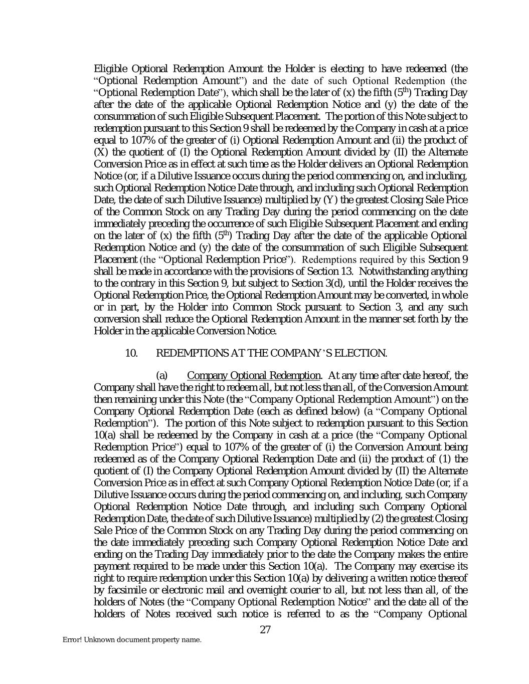 Eligible Optional Redemption Amount the Holder is electing to have redeemed (the “Optional Redemption Amount”) and the date of such Optional Redemption (the “Optional Redemption Date”), which shall be the later of (x) the fifth (5th) Trading Day after the date of the applicable Optional Redemption Notice and (y) the date of the consummation of such Eligible Subsequent Placement. The portion of this Note subject to redemption pursuant to this Section 9 shall be redeemed by the Company in cash at a price equal to 107% of the greater of (i) Optional Redemption Amount and (ii) the product of (X) the quotient of (I) the Optional Redemption Amount divided by (II) the Alternate Conversion Price as in effect at such time as the Holder delivers an Optional Redemption Notice (or, if a Dilutive Issuance occurs during the period commencing on, and including, such Optional Redemption Notice Date through, and including such Optional Redemption Date, the date of such Dilutive Issuance) multiplied by (Y) the greatest Closing Sale Price of the Common Stock on any Trading Day during the period commencing on the date immediately preceding the occurrence of such Eligible Subsequent Placement and ending on the later of (x) the fifth (5th) Trading Day after the date of the applicable Optional Redemption Notice and (y) the date of the consummation of such Eligible Subsequent Placement (the “Optional Redemption Price”). Redemptions required by this Section 9 shall be made in accordance with the provisions of Section 13. Notwithstanding anything to the contrary in this Section 9, but subject to Section 3(d), until the Holder receives the Optional Redemption Price, the Optional Redemption Amount may be converted, in whole or in part, by the Holder into Common Stock pursuant to Section 3, and any such conversion shall reduce the Optional Redemption Amount in the manner set forth by the Holder in the applicable Conversion Notice. 10. REDEMPTIONS AT THE COMPANY’S ELECTION. (a) Company Optional Redemption. At any time after date hereof, the Company shall have the right to redeem all, but not less than all, of the Conversion Amount then remaining under this Note (the “Company Optional Redemption Amount”) on the Company Optional Redemption Date (each as defined below) (a “Company Optional Redemption”). The portion of this Note subject to redemption pursuant to this Section 10(a) shall be redeemed by the Company in cash at a price (the “Company Optional Redemption Price”) equal to 107% of the greater of (i) the Conversion Amount being redeemed as of the Company Optional Redemption Date and (ii) the product of (1) the quotient of (I) the Company Optional Redemption Amount divided by (II) the Alternate Conversion Price as in effect at such Company Optional Redemption Notice Date (or, if a Dilutive Issuance occurs during the period commencing on, and including, such Company Optional Redemption Notice Date through, and including such Company Optional Redemption Date, the date of such Dilutive Issuance) multiplied by (2) the greatest Closing Sale Price of the Common Stock on any Trading Day during the period commencing on the date immediately preceding such Company Optional Redemption Notice Date and ending on the Trading Day immediately prior to the date the Company makes the entire payment required to be made under this Section 10(a). The Company may exercise its right to require redemption under this Section 10(a) by delivering a written notice thereof by facsimile or electronic mail and overnight courier to all, but not less than all, of the holders of Notes (the “Company Optional Redemption Notice” and the date all of the holders of Notes received such notice is referred to as the “Company Optional 27 Error! Unknown document property name.