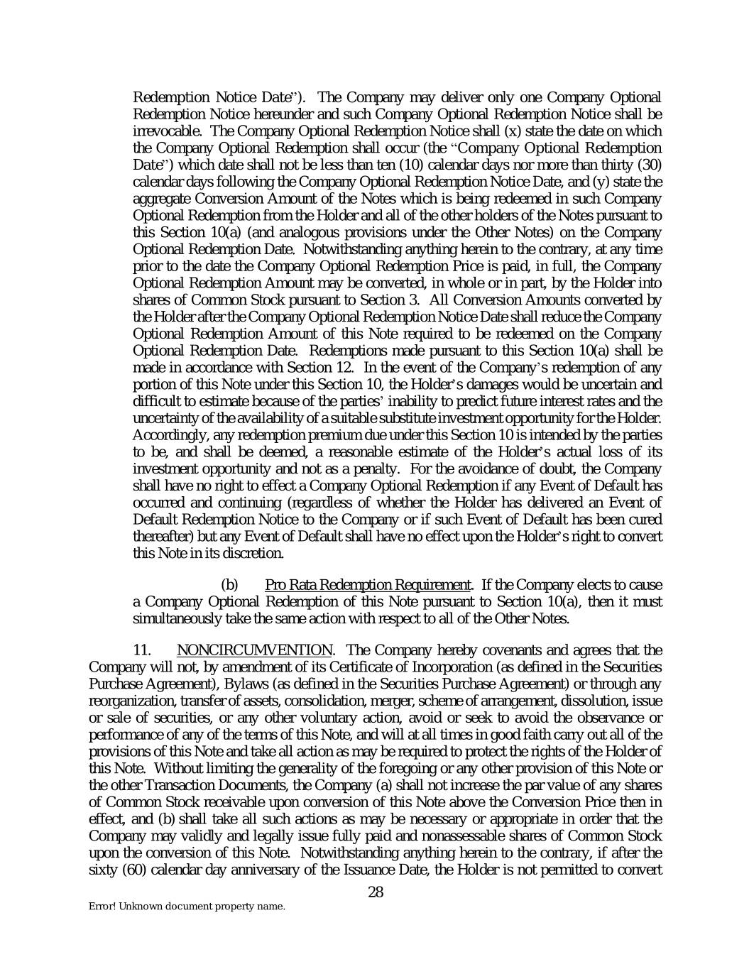 Redemption Notice Date”). The Company may deliver only one Company Optional Redemption Notice hereunder and such Company Optional Redemption Notice shall be irrevocable. The Company Optional Redemption Notice shall (x) state the date on which the Company Optional Redemption shall occur (the “Company Optional Redemption Date”) which date shall not be less than ten (10) calendar days nor more than thirty (30) calendar days following the Company Optional Redemption Notice Date, and (y) state the aggregate Conversion Amount of the Notes which is being redeemed in such Company Optional Redemption from the Holder and all of the other holders of the Notes pursuant to this Section 10(a) (and analogous provisions under the Other Notes) on the Company Optional Redemption Date. Notwithstanding anything herein to the contrary, at any time prior to the date the Company Optional Redemption Price is paid, in full, the Company Optional Redemption Amount may be converted, in whole or in part, by the Holder into shares of Common Stock pursuant to Section 3. All Conversion Amounts converted by the Holder after the Company Optional Redemption Notice Date shall reduce the Company Optional Redemption Amount of this Note required to be redeemed on the Company Optional Redemption Date. Redemptions made pursuant to this Section 10(a) shall be made in accordance with Section 12. In the event of the Company’s redemption of any portion of this Note under this Section 10, the Holder’s damages would be uncertain and difficult to estimate because of the parties’ inability to predict future interest rates and the uncertainty of the availability of a suitable substitute investment opportunity for the Holder. Accordingly, any redemption premium due under this Section 10 is intended by the parties to be, and shall be deemed, a reasonable estimate of the Holder’s actual loss of its investment opportunity and not as a penalty. For the avoidance of doubt, the Company shall have no right to effect a Company Optional Redemption if any Event of Default has occurred and continuing (regardless of whether the Holder has delivered an Event of Default Redemption Notice to the Company or if such Event of Default has been cured thereafter) but any Event of Default shall have no effect upon the Holder’s right to convert this Note in its discretion. (b) Pro Rata Redemption Requirement. If the Company elects to cause a Company Optional Redemption of this Note pursuant to Section 10(a), then it must simultaneously take the same action with respect to all of the Other Notes. 11. NONCIRCUMVENTION. The Company hereby covenants and agrees that the Company will not, by amendment of its Certificate of Incorporation (as defined in the Securities Purchase Agreement), Bylaws (as defined in the Securities Purchase Agreement) or through any reorganization, transfer of assets, consolidation, merger, scheme of arrangement, dissolution, issue or sale of securities, or any other voluntary action, avoid or seek to avoid the observance or performance of any of the terms of this Note, and will at all times in good faith carry out all of the provisions of this Note and take all action as may be required to protect the rights of the Holder of this Note. Without limiting the generality of the foregoing or any other provision of this Note or the other Transaction Documents, the Company (a) shall not increase the par value of any shares of Common Stock receivable upon conversion of this Note above the Conversion Price then in effect, and (b) shall take all such actions as may be necessary or appropriate in order that the Company may validly and legally issue fully paid and nonassessable shares of Common Stock upon the conversion of this Note. Notwithstanding anything herein to the contrary, if after the sixty (60) calendar day anniversary of the Issuance Date, the Holder is not permitted to convert 28 Error! Unknown document property name.