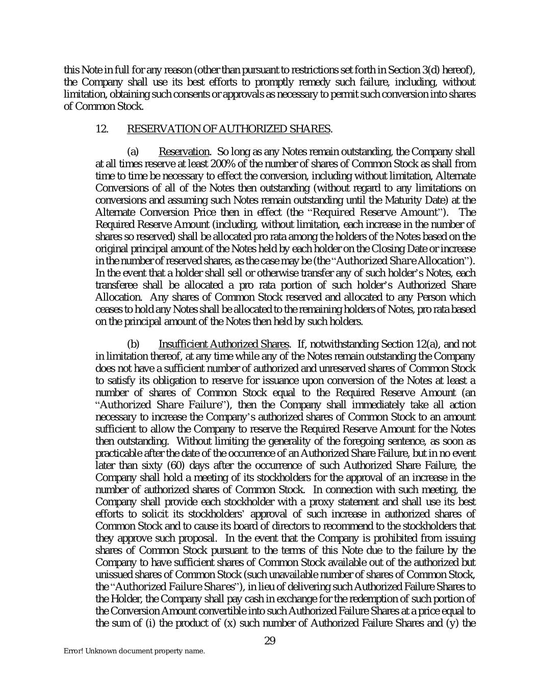 this Note in full for any reason (other than pursuant to restrictions set forth in Section 3(d) hereof), the Company shall use its best efforts to promptly remedy such failure, including, without limitation, obtaining such consents or approvals as necessary to permit such conversion into shares of Common Stock. 12. RESERVATION OF AUTHORIZED SHARES. (a) Reservation. So long as any Notes remain outstanding, the Company shall at all times reserve at least 200% of the number of shares of Common Stock as shall from time to time be necessary to effect the conversion, including without limitation, Alternate Conversions of all of the Notes then outstanding (without regard to any limitations on conversions and assuming such Notes remain outstanding until the Maturity Date) at the Alternate Conversion Price then in effect (the “Required Reserve Amount”). The Required Reserve Amount (including, without limitation, each increase in the number of shares so reserved) shall be allocated pro rata among the holders of the Notes based on the original principal amount of the Notes held by each holder on the Closing Date or increase in the number of reserved shares, as the case may be (the “Authorized Share Allocation”). In the event that a holder shall sell or otherwise transfer any of such holder’s Notes, each transferee shall be allocated a pro rata portion of such holder’s Authorized Share Allocation. Any shares of Common Stock reserved and allocated to any Person which ceases to hold any Notes shall be allocated to the remaining holders of Notes, pro rata based on the principal amount of the Notes then held by such holders. (b) Insufficient Authorized Shares. If, notwithstanding Section 12(a), and not in limitation thereof, at any time while any of the Notes remain outstanding the Company does not have a sufficient number of authorized and unreserved shares of Common Stock to satisfy its obligation to reserve for issuance upon conversion of the Notes at least a number of shares of Common Stock equal to the Required Reserve Amount (an “Authorized Share Failure”), then the Company shall immediately take all action necessary to increase the Company’s authorized shares of Common Stock to an amount sufficient to allow the Company to reserve the Required Reserve Amount for the Notes then outstanding. Without limiting the generality of the foregoing sentence, as soon as practicable after the date of the occurrence of an Authorized Share Failure, but in no event later than sixty (60) days after the occurrence of such Authorized Share Failure, the Company shall hold a meeting of its stockholders for the approval of an increase in the number of authorized shares of Common Stock. In connection with such meeting, the Company shall provide each stockholder with a proxy statement and shall use its best efforts to solicit its stockholders’ approval of such increase in authorized shares of Common Stock and to cause its board of directors to recommend to the stockholders that they approve such proposal. In the event that the Company is prohibited from issuing shares of Common Stock pursuant to the terms of this Note due to the failure by the Company to have sufficient shares of Common Stock available out of the authorized but unissued shares of Common Stock (such unavailable number of shares of Common Stock, the “Authorized Failure Shares”), in lieu of delivering such Authorized Failure Shares to the Holder, the Company shall pay cash in exchange for the redemption of such portion of the Conversion Amount convertible into such Authorized Failure Shares at a price equal to the sum of (i) the product of (x) such number of Authorized Failure Shares and (y) the 29 Error! Unknown document property name.