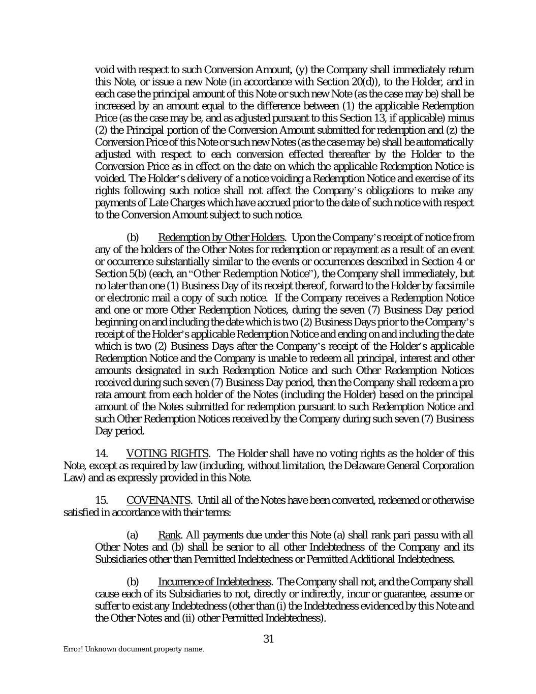 void with respect to such Conversion Amount, (y) the Company shall immediately return this Note, or issue a new Note (in accordance with Section 20(d)), to the Holder, and in each case the principal amount of this Note or such new Note (as the case may be) shall be increased by an amount equal to the difference between (1) the applicable Redemption Price (as the case may be, and as adjusted pursuant to this Section 13, if applicable) minus (2) the Principal portion of the Conversion Amount submitted for redemption and (z) the Conversion Price of this Note or such new Notes (as the case may be) shall be automatically adjusted with respect to each conversion effected thereafter by the Holder to the Conversion Price as in effect on the date on which the applicable Redemption Notice is voided. The Holder’s delivery of a notice voiding a Redemption Notice and exercise of its rights following such notice shall not affect the Company’s obligations to make any payments of Late Charges which have accrued prior to the date of such notice with respect to the Conversion Amount subject to such notice. (b) Redemption by Other Holders. Upon the Company’s receipt of notice from any of the holders of the Other Notes for redemption or repayment as a result of an event or occurrence substantially similar to the events or occurrences described in Section 4 or Section 5(b) (each, an “Other Redemption Notice”), the Company shall immediately, but no later than one (1) Business Day of its receipt thereof, forward to the Holder by facsimile or electronic mail a copy of such notice. If the Company receives a Redemption Notice and one or more Other Redemption Notices, during the seven (7) Business Day period beginning on and including the date which is two (2) Business Days prior to the Company’s receipt of the Holder’s applicable Redemption Notice and ending on and including the date which is two (2) Business Days after the Company’s receipt of the Holder’s applicable Redemption Notice and the Company is unable to redeem all principal, interest and other amounts designated in such Redemption Notice and such Other Redemption Notices received during such seven (7) Business Day period, then the Company shall redeem a pro rata amount from each holder of the Notes (including the Holder) based on the principal amount of the Notes submitted for redemption pursuant to such Redemption Notice and such Other Redemption Notices received by the Company during such seven (7) Business Day period. 14. VOTING RIGHTS. The Holder shall have no voting rights as the holder of this Note, except as required by law (including, without limitation, the Delaware General Corporation Law) and as expressly provided in this Note. 15. COVENANTS. Until all of the Notes have been converted, redeemed or otherwise satisfied in accordance with their terms: (a) Rank. All payments due under this Note (a) shall rank pari passu with all Other Notes and (b) shall be senior to all other Indebtedness of the Company and its Subsidiaries other than Permitted Indebtedness or Permitted Additional Indebtedness. (b) Incurrence of Indebtedness. The Company shall not, and the Company shall cause each of its Subsidiaries to not, directly or indirectly, incur or guarantee, assume or suffer to exist any Indebtedness (other than (i) the Indebtedness evidenced by this Note and the Other Notes and (ii) other Permitted Indebtedness). 31 Error! Unknown document property name.