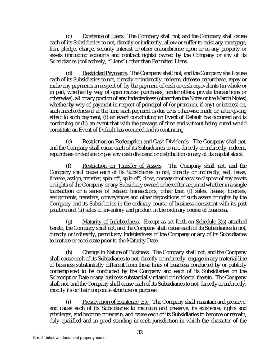 (c) Existence of Liens. The Company shall not, and the Company shall cause each of its Subsidiaries to not, directly or indirectly, allow or suffer to exist any mortgage, lien, pledge, charge, security interest or other encumbrance upon or in any property or assets (including accounts and contract rights) owned by the Company or any of its Subsidiaries (collectively, “Liens”) other than Permitted Liens. (d) Restricted Payments. The Company shall not, and the Company shall cause each of its Subsidiaries to not, directly or indirectly, redeem, defease, repurchase, repay or make any payments in respect of, by the payment of cash or cash equivalents (in whole or in part, whether by way of open market purchases, tender offers, private transactions or otherwise), all or any portion of any Indebtedness (other than the Notes or the March Notes) whether by way of payment in respect of principal of (or premium, if any) or interest on, such Indebtedness if at the time such payment is due or is otherwise made or, after giving effect to such payment, (i) an event constituting an Event of Default has occurred and is continuing or (ii) an event that with the passage of time and without being cured would constitute an Event of Default has occurred and is continuing. (e) Restriction on Redemption and Cash Dividends. The Company shall not, and the Company shall cause each of its Subsidiaries to not, directly or indirectly, redeem, repurchase or declare or pay any cash dividend or distribution on any of its capital stock. (f) Restriction on Transfer of Assets. The Company shall not, and the Company shall cause each of its Subsidiaries to not, directly or indirectly, sell, lease, license, assign, transfer, spin-off, split-off, close, convey or otherwise dispose of any assets or rights of the Company or any Subsidiary owned or hereafter acquired whether in a single transaction or a series of related transactions, other than (i) sales, leases, licenses, assignments, transfers, conveyances and other dispositions of such assets or rights by the Company and its Subsidiaries in the ordinary course of business consistent with its past practice and (ii) sales of inventory and product in the ordinary course of business. (g) Maturity of Indebtedness. Except as set forth on Schedule 3(s) attached hereto, the Company shall not, and the Company shall cause each of its Subsidiaries to not, directly or indirectly, permit any Indebtedness of the Company or any of its Subsidiaries to mature or accelerate prior to the Maturity Date. (h) Change in Nature of Business. The Company shall not, and the Company shall cause each of its Subsidiaries to not, directly or indirectly, engage in any material line of business substantially different from those lines of business conducted by or publicly contemplated to be conducted by the Company and each of its Subsidiaries on the Subscription Date or any business substantially related or incidental thereto. The Company shall not, and the Company shall cause each of its Subsidiaries to not, directly or indirectly, modify its or their corporate structure or purpose. (i) Preservation of Existence, Etc. The Company shall maintain and preserve, and cause each of its Subsidiaries to maintain and preserve, its existence, rights and privileges, and become or remain, and cause each of its Subsidiaries to become or remain, duly qualified and in good standing in each jurisdiction in which the character of the 32 Error! Unknown document property name.