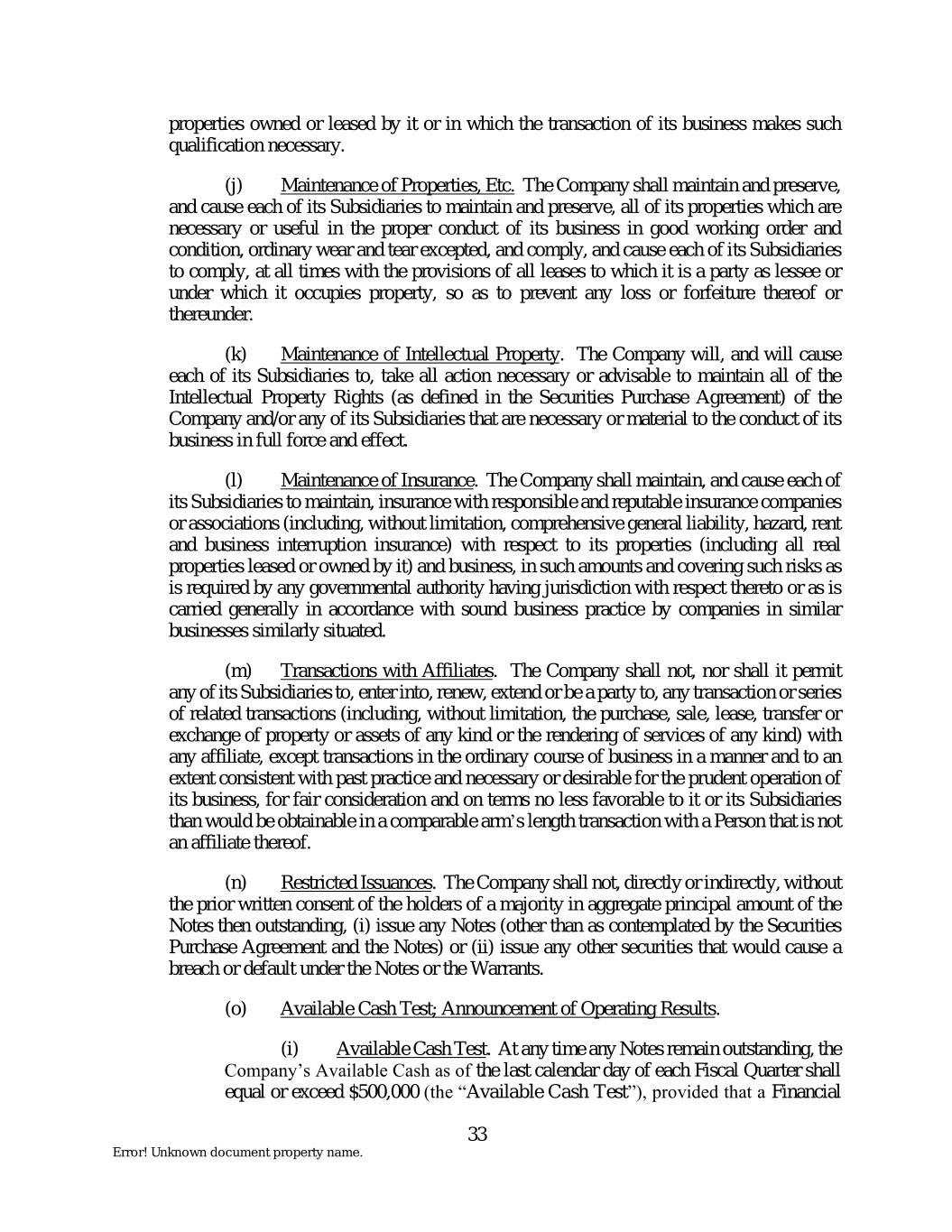 properties owned or leased by it or in which the transaction of its business makes such qualification necessary. (j) Maintenance of Properties, Etc. The Company shall maintain and preserve, and cause each of its Subsidiaries to maintain and preserve, all of its properties which are necessary or useful in the proper conduct of its business in good working order and condition, ordinary wear and tear excepted, and comply, and cause each of its Subsidiaries to comply, at all times with the provisions of all leases to which it is a party as lessee or under which it occupies property, so as to prevent any loss or forfeiture thereof or thereunder. (k) Maintenance of Intellectual Property. The Company will, and will cause each of its Subsidiaries to, take all action necessary or advisable to maintain all of the Intellectual Property Rights (as defined in the Securities Purchase Agreement) of the Company and/or any of its Subsidiaries that are necessary or material to the conduct of its business in full force and effect. (l) Maintenance of Insurance. The Company shall maintain, and cause each of its Subsidiaries to maintain, insurance with responsible and reputable insurance companies or associations (including, without limitation, comprehensive general liability, hazard, rent and business interruption insurance) with respect to its properties (including all real properties leased or owned by it) and business, in such amounts and covering such risks as is required by any governmental authority having jurisdiction with respect thereto or as is carried generally in accordance with sound business practice by companies in similar businesses similarly situated. (m) Transactions with Affiliates. The Company shall not, nor shall it permit any of its Subsidiaries to, enter into, renew, extend or be a party to, any transaction or series of related transactions (including, without limitation, the purchase, sale, lease, transfer or exchange of property or assets of any kind or the rendering of services of any kind) with any affiliate, except transactions in the ordinary course of business in a manner and to an extent consistent with past practice and necessary or desirable for the prudent operation of its business, for fair consideration and on terms no less favorable to it or its Subsidiaries than would be obtainable in a comparable arm’s length transaction with a Person that is not an affiliate thereof. (n) Restricted Issuances. The Company shall not, directly or indirectly, without the prior written consent of the holders of a majority in aggregate principal amount of the Notes then outstanding, (i) issue any Notes (other than as contemplated by the Securities Purchase Agreement and the Notes) or (ii) issue any other securities that would cause a breach or default under the Notes or the Warrants. (o) Available Cash Test; Announcement of Operating Results. (i) Available Cash Test. At any time any Notes remain outstanding, the Company’s Available Cash as of the last calendar day of each Fiscal Quarter shall equal or exceed $500,000 (the “Available Cash Test”), provided that a Financial 33 Error! Unknown document property name.