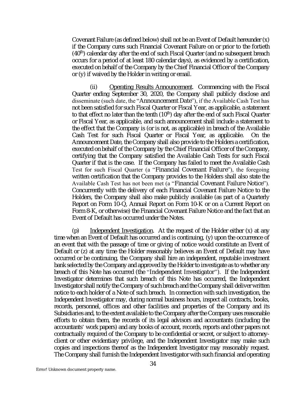 Covenant Failure (as defined below) shall not be an Event of Default hereunder (x) if the Company cures such Financial Covenant Failure on or prior to the fortieth (40th) calendar day after the end of such Fiscal Quarter (and no subsequent breach occurs for a period of at least 180 calendar days), as evidenced by a certification, executed on behalf of the Company by the Chief Financial Officer of the Company or (y) if waived by the Holder in writing or email. (ii) Operating Results Announcement. Commencing with the Fiscal Quarter ending September 30, 2020, the Company shall publicly disclose and disseminate (such date, the “Announcement Date”), if the Available Cash Test has not been satisfied for such Fiscal Quarter or Fiscal Year, as applicable, a statement to that effect no later than the tenth (10th) day after the end of such Fiscal Quarter or Fiscal Year, as applicable, and such announcement shall include a statement to the effect that the Company is (or is not, as applicable) in breach of the Available Cash Test for such Fiscal Quarter or Fiscal Year, as applicable. On the Announcement Date, the Company shall also provide to the Holders a certification, executed on behalf of the Company by the Chief Financial Officer of the Company, certifying that the Company satisfied the Available Cash Tests for such Fiscal Quarter if that is the case. If the Company has failed to meet the Available Cash Test for such Fiscal Quarter (a “Financial Covenant Failure”), the foregoing written certification that the Company provides to the Holders shall also state the Available Cash Test has not been met (a “Financial Covenant Failure Notice”). Concurrently with the delivery of each Financial Covenant Failure Notice to the Holders, the Company shall also make publicly available (as part of a Quarterly Report on Form 10-Q, Annual Report on Form 10-K or on a Current Report on Form 8-K, or otherwise) the Financial Covenant Failure Notice and the fact that an Event of Default has occurred under the Notes. (p) Independent Investigation. At the request of the Holder either (x) at any time when an Event of Default has occurred and is continuing, (y) upon the occurrence of an event that with the passage of time or giving of notice would constitute an Event of Default or (z) at any time the Holder reasonably believes an Event of Default may have occurred or be continuing, the Company shall hire an independent, reputable investment bank selected by the Company and approved by the Holder to investigate as to whether any breach of this Note has occurred (the “Independent Investigator”). If the Independent Investigator determines that such breach of this Note has occurred, the Independent Investigator shall notify the Company of such breach and the Company shall deliver written notice to each holder of a Note of such breach. In connection with such investigation, the Independent Investigator may, during normal business hours, inspect all contracts, books, records, personnel, offices and other facilities and properties of the Company and its Subsidiaries and, to the extent available to the Company after the Company uses reasonable efforts to obtain them, the records of its legal advisors and accountants (including the accountants’ work papers) and any books of account, records, reports and other papers not contractually required of the Company to be confidential or secret, or subject to attorney- client or other evidentiary privilege, and the Independent Investigator may make such copies and inspections thereof as the Independent Investigator may reasonably request. The Company shall furnish the Independent Investigator with such financial and operating 34 Error! Unknown document property name.