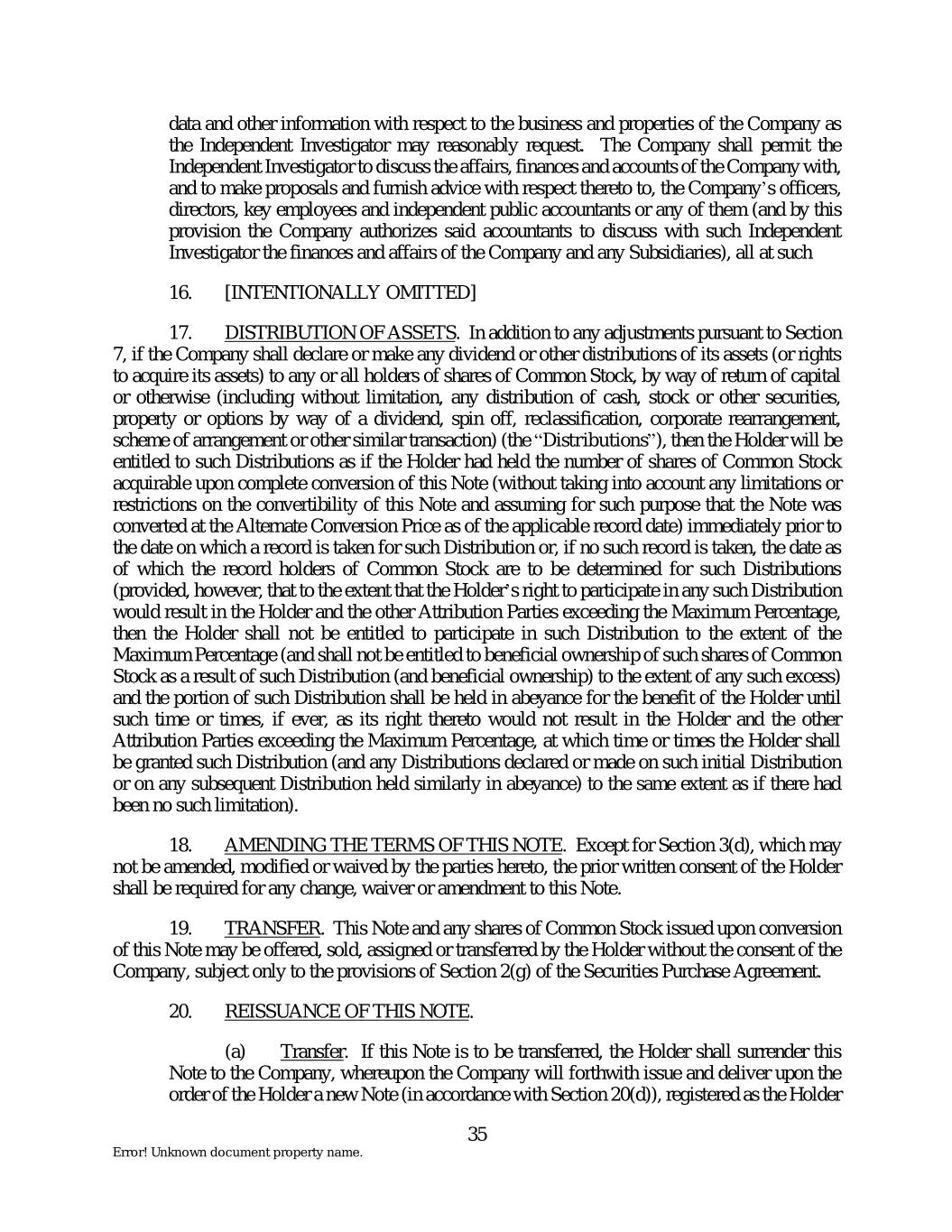 data and other information with respect to the business and properties of the Company as the Independent Investigator may reasonably request. The Company shall permit the Independent Investigator to discuss the affairs, finances and accounts of the Company with, and to make proposals and furnish advice with respect thereto to, the Company’s officers, directors, key employees and independent public accountants or any of them (and by this provision the Company authorizes said accountants to discuss with such Independent Investigator the finances and affairs of the Company and any Subsidiaries), all at such 16. [INTENTIONALLY OMITTED] 17. DISTRIBUTION OF ASSETS. In addition to any adjustments pursuant to Section 7, if the Company shall declare or make any dividend or other distributions of its assets (or rights to acquire its assets) to any or all holders of shares of Common Stock, by way of return of capital or otherwise (including without limitation, any distribution of cash, stock or other securities, property or options by way of a dividend, spin off, reclassification, corporate rearrangement, scheme of arrangement or other similar transaction) (the “Distributions”), then the Holder will be entitled to such Distributions as if the Holder had held the number of shares of Common Stock acquirable upon complete conversion of this Note (without taking into account any limitations or restrictions on the convertibility of this Note and assuming for such purpose that the Note was converted at the Alternate Conversion Price as of the applicable record date) immediately prior to the date on which a record is taken for such Distribution or, if no such record is taken, the date as of which the record holders of Common Stock are to be determined for such Distributions (provided, however, that to the extent that the Holder’s right to participate in any such Distribution would result in the Holder and the other Attribution Parties exceeding the Maximum Percentage, then the Holder shall not be entitled to participate in such Distribution to the extent of the Maximum Percentage (and shall not be entitled to beneficial ownership of such shares of Common Stock as a result of such Distribution (and beneficial ownership) to the extent of any such excess) and the portion of such Distribution shall be held in abeyance for the benefit of the Holder until such time or times, if ever, as its right thereto would not result in the Holder and the other Attribution Parties exceeding the Maximum Percentage, at which time or times the Holder shall be granted such Distribution (and any Distributions declared or made on such initial Distribution or on any subsequent Distribution held similarly in abeyance) to the same extent as if there had been no such limitation). 18. AMENDING THE TERMS OF THIS NOTE. Except for Section 3(d), which may not be amended, modified or waived by the parties hereto, the prior written consent of the Holder shall be required for any change, waiver or amendment to this Note. 19. TRANSFER. This Note and any shares of Common Stock issued upon conversion of this Note may be offered, sold, assigned or transferred by the Holder without the consent of the Company, subject only to the provisions of Section 2(g) of the Securities Purchase Agreement. 20. REISSUANCE OF THIS NOTE. (a) Transfer. If this Note is to be transferred, the Holder shall surrender this Note to the Company, whereupon the Company will forthwith issue and deliver upon the order of the Holder a new Note (in accordance with Section 20(d)), registered as the Holder 35 Error! Unknown document property name.