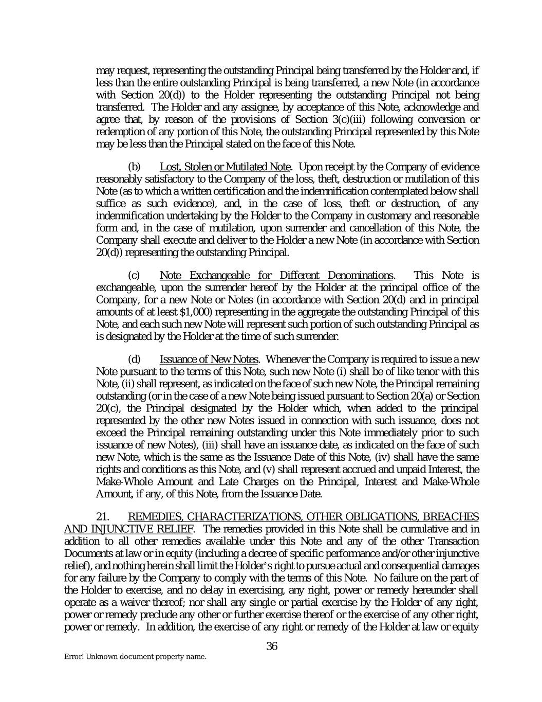 may request, representing the outstanding Principal being transferred by the Holder and, if less than the entire outstanding Principal is being transferred, a new Note (in accordance with Section 20(d)) to the Holder representing the outstanding Principal not being transferred. The Holder and any assignee, by acceptance of this Note, acknowledge and agree that, by reason of the provisions of Section 3(c)(iii) following conversion or redemption of any portion of this Note, the outstanding Principal represented by this Note may be less than the Principal stated on the face of this Note. (b) Lost, Stolen or Mutilated Note. Upon receipt by the Company of evidence reasonably satisfactory to the Company of the loss, theft, destruction or mutilation of this Note (as to which a written certification and the indemnification contemplated below shall suffice as such evidence), and, in the case of loss, theft or destruction, of any indemnification undertaking by the Holder to the Company in customary and reasonable form and, in the case of mutilation, upon surrender and cancellation of this Note, the Company shall execute and deliver to the Holder a new Note (in accordance with Section 20(d)) representing the outstanding Principal. (c) Note Exchangeable for Different Denominations. This Note is exchangeable, upon the surrender hereof by the Holder at the principal office of the Company, for a new Note or Notes (in accordance with Section 20(d) and in principal amounts of at least $1,000) representing in the aggregate the outstanding Principal of this Note, and each such new Note will represent such portion of such outstanding Principal as is designated by the Holder at the time of such surrender. (d) Issuance of New Notes. Whenever the Company is required to issue a new Note pursuant to the terms of this Note, such new Note (i) shall be of like tenor with this Note, (ii) shall represent, as indicated on the face of such new Note, the Principal remaining outstanding (or in the case of a new Note being issued pursuant to Section 20(a) or Section 20(c), the Principal designated by the Holder which, when added to the principal represented by the other new Notes issued in connection with such issuance, does not exceed the Principal remaining outstanding under this Note immediately prior to such issuance of new Notes), (iii) shall have an issuance date, as indicated on the face of such new Note, which is the same as the Issuance Date of this Note, (iv) shall have the same rights and conditions as this Note, and (v) shall represent accrued and unpaid Interest, the Make-Whole Amount and Late Charges on the Principal, Interest and Make-Whole Amount, if any, of this Note, from the Issuance Date. 21. REMEDIES, CHARACTERIZATIONS, OTHER OBLIGATIONS, BREACHES AND INJUNCTIVE RELIEF. The remedies provided in this Note shall be cumulative and in addition to all other remedies available under this Note and any of the other Transaction Documents at law or in equity (including a decree of specific performance and/or other injunctive relief), and nothing herein shall limit the Holder’s right to pursue actual and consequential damages for any failure by the Company to comply with the terms of this Note. No failure on the part of the Holder to exercise, and no delay in exercising, any right, power or remedy hereunder shall operate as a waiver thereof; nor shall any single or partial exercise by the Holder of any right, power or remedy preclude any other or further exercise thereof or the exercise of any other right, power or remedy. In addition, the exercise of any right or remedy of the Holder at law or equity 36 Error! Unknown document property name.