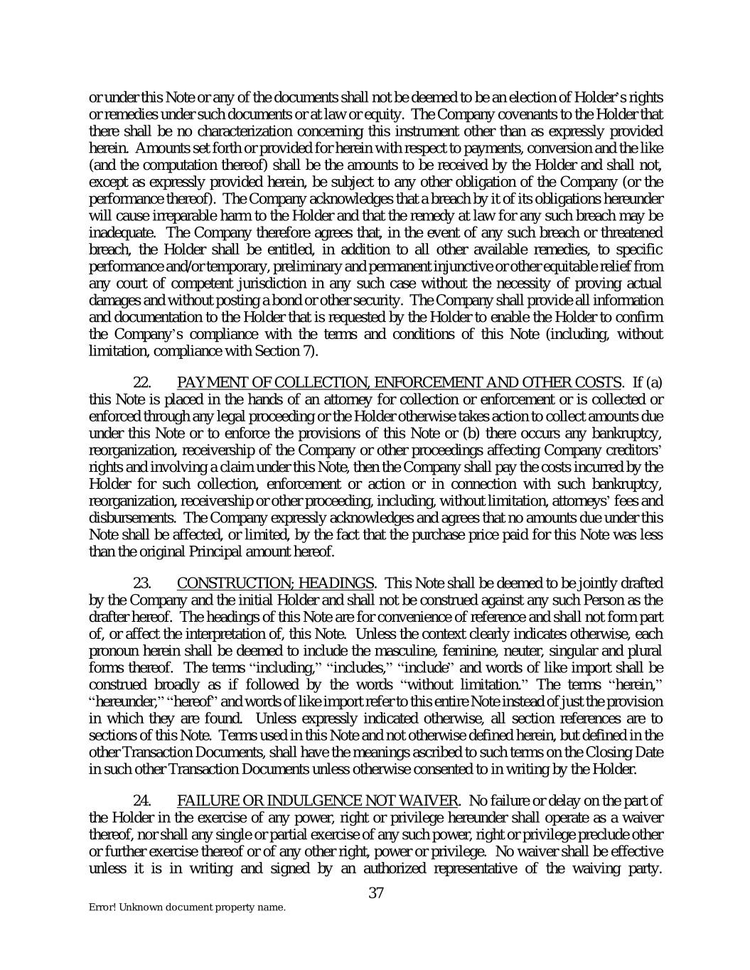 or under this Note or any of the documents shall not be deemed to be an election of Holder’s rights or remedies under such documents or at law or equity. The Company covenants to the Holder that there shall be no characterization concerning this instrument other than as expressly provided herein. Amounts set forth or provided for herein with respect to payments, conversion and the like (and the computation thereof) shall be the amounts to be received by the Holder and shall not, except as expressly provided herein, be subject to any other obligation of the Company (or the performance thereof). The Company acknowledges that a breach by it of its obligations hereunder will cause irreparable harm to the Holder and that the remedy at law for any such breach may be inadequate. The Company therefore agrees that, in the event of any such breach or threatened breach, the Holder shall be entitled, in addition to all other available remedies, to specific performance and/or temporary, preliminary and permanent injunctive or other equitable relief from any court of competent jurisdiction in any such case without the necessity of proving actual damages and without posting a bond or other security. The Company shall provide all information and documentation to the Holder that is requested by the Holder to enable the Holder to confirm the Company’s compliance with the terms and conditions of this Note (including, without limitation, compliance with Section 7). 22. PAYMENT OF COLLECTION, ENFORCEMENT AND OTHER COSTS. If (a) this Note is placed in the hands of an attorney for collection or enforcement or is collected or enforced through any legal proceeding or the Holder otherwise takes action to collect amounts due under this Note or to enforce the provisions of this Note or (b) there occurs any bankruptcy, reorganization, receivership of the Company or other proceedings affecting Company creditors’ rights and involving a claim under this Note, then the Company shall pay the costs incurred by the Holder for such collection, enforcement or action or in connection with such bankruptcy, reorganization, receivership or other proceeding, including, without limitation, attorneys’ fees and disbursements. The Company expressly acknowledges and agrees that no amounts due under this Note shall be affected, or limited, by the fact that the purchase price paid for this Note was less than the original Principal amount hereof. 23. CONSTRUCTION; HEADINGS. This Note shall be deemed to be jointly drafted by the Company and the initial Holder and shall not be construed against any such Person as the drafter hereof. The headings of this Note are for convenience of reference and shall not form part of, or affect the interpretation of, this Note. Unless the context clearly indicates otherwise, each pronoun herein shall be deemed to include the masculine, feminine, neuter, singular and plural forms thereof. The terms “including,” “includes,” “include” and words of like import shall be construed broadly as if followed by the words “without limitation.” The terms “herein,” “hereunder,” “hereof” and words of like import refer to this entire Note instead of just the provision in which they are found. Unless expressly indicated otherwise, all section references are to sections of this Note. Terms used in this Note and not otherwise defined herein, but defined in the other Transaction Documents, shall have the meanings ascribed to such terms on the Closing Date in such other Transaction Documents unless otherwise consented to in writing by the Holder. 24. FAILURE OR INDULGENCE NOT WAIVER. No failure or delay on the part of the Holder in the exercise of any power, right or privilege hereunder shall operate as a waiver thereof, nor shall any single or partial exercise of any such power, right or privilege preclude other or further exercise thereof or of any other right, power or privilege. No waiver shall be effective unless it is in writing and signed by an authorized representative of the waiving party. 37 Error! Unknown document property name.