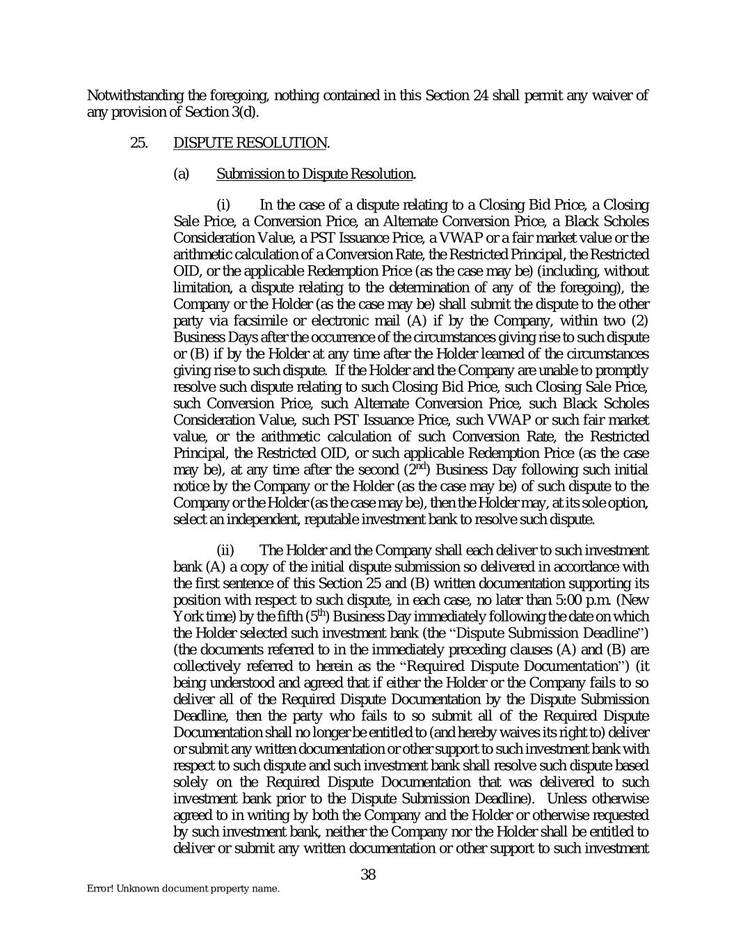Notwithstanding the foregoing, nothing contained in this Section 24 shall permit any waiver of any provision of Section 3(d). 25. DISPUTE RESOLUTION. (a) Submission to Dispute Resolution. (i) In the case of a dispute relating to a Closing Bid Price, a Closing Sale Price, a Conversion Price, an Alternate Conversion Price, a Black Scholes Consideration Value, a PST Issuance Price, a VWAP or a fair market value or the arithmetic calculation of a Conversion Rate, the Restricted Principal, the Restricted OID, or the applicable Redemption Price (as the case may be) (including, without limitation, a dispute relating to the determination of any of the foregoing), the Company or the Holder (as the case may be) shall submit the dispute to the other party via facsimile or electronic mail (A) if by the Company, within two (2) Business Days after the occurrence of the circumstances giving rise to such dispute or (B) if by the Holder at any time after the Holder learned of the circumstances giving rise to such dispute. If the Holder and the Company are unable to promptly resolve such dispute relating to such Closing Bid Price, such Closing Sale Price, such Conversion Price, such Alternate Conversion Price, such Black Scholes Consideration Value, such PST Issuance Price, such VWAP or such fair market value, or the arithmetic calculation of such Conversion Rate, the Restricted Principal, the Restricted OID, or such applicable Redemption Price (as the case may be), at any time after the second (2nd) Business Day following such initial notice by the Company or the Holder (as the case may be) of such dispute to the Company or the Holder (as the case may be), then the Holder may, at its sole option, select an independent, reputable investment bank to resolve such dispute. (ii) The Holder and the Company shall each deliver to such investment bank (A) a copy of the initial dispute submission so delivered in accordance with the first sentence of this Section 25 and (B) written documentation supporting its position with respect to such dispute, in each case, no later than 5:00 p.m. (New York time) by the fifth (5th) Business Day immediately following the date on which the Holder selected such investment bank (the “Dispute Submission Deadline”) (the documents referred to in the immediately preceding clauses (A) and (B) are collectively referred to herein as the “Required Dispute Documentation”) (it being understood and agreed that if either the Holder or the Company fails to so deliver all of the Required Dispute Documentation by the Dispute Submission Deadline, then the party who fails to so submit all of the Required Dispute Documentation shall no longer be entitled to (and hereby waives its right to) deliver or submit any written documentation or other support to such investment bank with respect to such dispute and such investment bank shall resolve such dispute based solely on the Required Dispute Documentation that was delivered to such investment bank prior to the Dispute Submission Deadline). Unless otherwise agreed to in writing by both the Company and the Holder or otherwise requested by such investment bank, neither the Company nor the Holder shall be entitled to deliver or submit any written documentation or other support to such investment 38 Error! Unknown document property name.