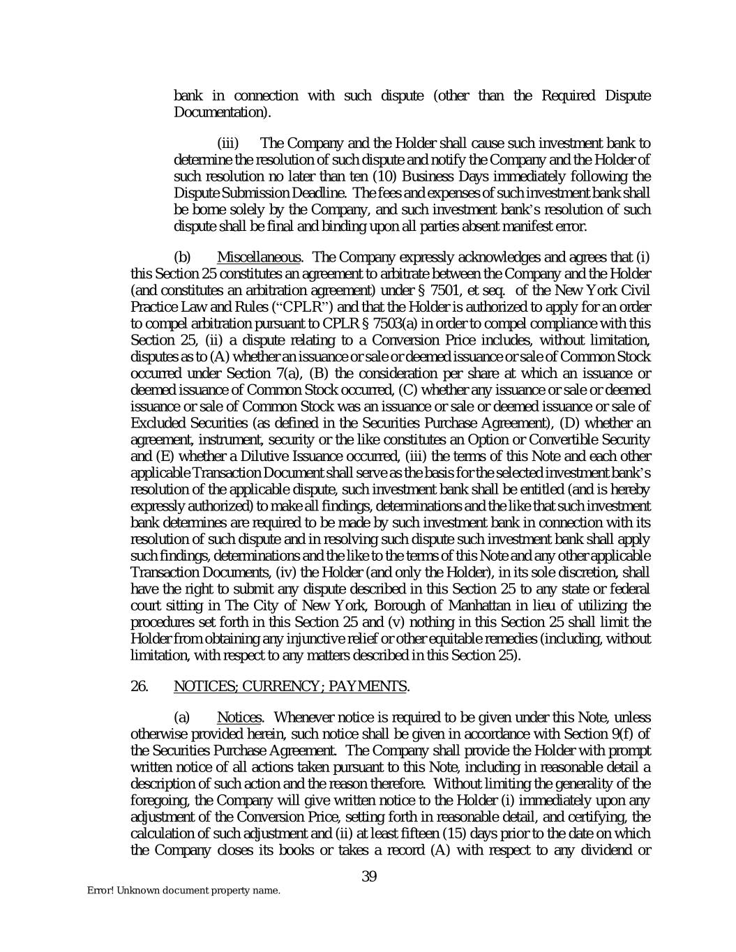 bank in connection with such dispute (other than the Required Dispute Documentation). (iii) The Company and the Holder shall cause such investment bank to determine the resolution of such dispute and notify the Company and the Holder of such resolution no later than ten (10) Business Days immediately following the Dispute Submission Deadline. The fees and expenses of such investment bank shall be borne solely by the Company, and such investment bank’s resolution of such dispute shall be final and binding upon all parties absent manifest error. (b) Miscellaneous. The Company expressly acknowledges and agrees that (i) this Section 25 constitutes an agreement to arbitrate between the Company and the Holder (and constitutes an arbitration agreement) under § 7501, et seq. of the New York Civil Practice Law and Rules (“CPLR”) and that the Holder is authorized to apply for an order to compel arbitration pursuant to CPLR § 7503(a) in order to compel compliance with this Section 25, (ii) a dispute relating to a Conversion Price includes, without limitation, disputes as to (A) whether an issuance or sale or deemed issuance or sale of Common Stock occurred under Section 7(a), (B) the consideration per share at which an issuance or deemed issuance of Common Stock occurred, (C) whether any issuance or sale or deemed issuance or sale of Common Stock was an issuance or sale or deemed issuance or sale of Excluded Securities (as defined in the Securities Purchase Agreement), (D) whether an agreement, instrument, security or the like constitutes an Option or Convertible Security and (E) whether a Dilutive Issuance occurred, (iii) the terms of this Note and each other applicable Transaction Document shall serve as the basis for the selected investment bank’s resolution of the applicable dispute, such investment bank shall be entitled (and is hereby expressly authorized) to make all findings, determinations and the like that such investment bank determines are required to be made by such investment bank in connection with its resolution of such dispute and in resolving such dispute such investment bank shall apply such findings, determinations and the like to the terms of this Note and any other applicable Transaction Documents, (iv) the Holder (and only the Holder), in its sole discretion, shall have the right to submit any dispute described in this Section 25 to any state or federal court sitting in The City of New York, Borough of Manhattan in lieu of utilizing the procedures set forth in this Section 25 and (v) nothing in this Section 25 shall limit the Holder from obtaining any injunctive relief or other equitable remedies (including, without limitation, with respect to any matters described in this Section 25). 26. NOTICES; CURRENCY; PAYMENTS. (a) Notices. Whenever notice is required to be given under this Note, unless otherwise provided herein, such notice shall be given in accordance with Section 9(f) of the Securities Purchase Agreement. The Company shall provide the Holder with prompt written notice of all actions taken pursuant to this Note, including in reasonable detail a description of such action and the reason therefore. Without limiting the generality of the foregoing, the Company will give written notice to the Holder (i) immediately upon any adjustment of the Conversion Price, setting forth in reasonable detail, and certifying, the calculation of such adjustment and (ii) at least fifteen (15) days prior to the date on which the Company closes its books or takes a record (A) with respect to any dividend or 39 Error! Unknown document property name.