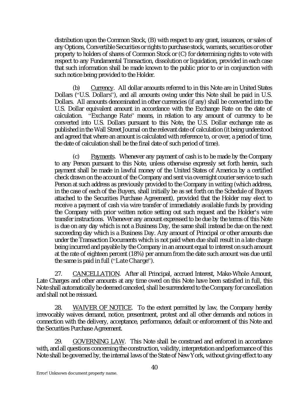 distribution upon the Common Stock, (B) with respect to any grant, issuances, or sales of any Options, Convertible Securities or rights to purchase stock, warrants, securities or other property to holders of shares of Common Stock or (C) for determining rights to vote with respect to any Fundamental Transaction, dissolution or liquidation, provided in each case that such information shall be made known to the public prior to or in conjunction with such notice being provided to the Holder. (b) Currency. All dollar amounts referred to in this Note are in United States Dollars (“U.S. Dollars”), and all amounts owing under this Note shall be paid in U.S. Dollars. All amounts denominated in other currencies (if any) shall be converted into the U.S. Dollar equivalent amount in accordance with the Exchange Rate on the date of calculation. “Exchange Rate” means, in relation to any amount of currency to be converted into U.S. Dollars pursuant to this Note, the U.S. Dollar exchange rate as published in the Wall Street Journal on the relevant date of calculation (it being understood and agreed that where an amount is calculated with reference to, or over, a period of time, the date of calculation shall be the final date of such period of time). (c) Payments. Whenever any payment of cash is to be made by the Company to any Person pursuant to this Note, unless otherwise expressly set forth herein, such payment shall be made in lawful money of the United States of America by a certified check drawn on the account of the Company and sent via overnight courier service to such Person at such address as previously provided to the Company in writing (which address, in the case of each of the Buyers, shall initially be as set forth on the Schedule of Buyers attached to the Securities Purchase Agreement), provided that the Holder may elect to receive a payment of cash via wire transfer of immediately available funds by providing the Company with prior written notice setting out such request and the Holder’s wire transfer instructions. Whenever any amount expressed to be due by the terms of this Note is due on any day which is not a Business Day, the same shall instead be due on the next succeeding day which is a Business Day. Any amount of Principal or other amounts due under the Transaction Documents which is not paid when due shall result in a late charge being incurred and payable by the Company in an amount equal to interest on such amount at the rate of eighteen percent (18%) per annum from the date such amount was due until the same is paid in full (“Late Charge”). 27. CANCELLATION. After all Principal, accrued Interest, Make-Whole Amount, Late Charges and other amounts at any time owed on this Note have been satisfied in full, this Note shall automatically be deemed canceled, shall be surrendered to the Company for cancellation and shall not be reissued. 28. WAIVER OF NOTICE. To the extent permitted by law, the Company hereby irrevocably waives demand, notice, presentment, protest and all other demands and notices in connection with the delivery, acceptance, performance, default or enforcement of this Note and the Securities Purchase Agreement. 29. GOVERNING LAW. This Note shall be construed and enforced in accordance with, and all questions concerning the construction, validity, interpretation and performance of this Note shall be governed by, the internal laws of the State of New York, without giving effect to any 40 Error! Unknown document property name.