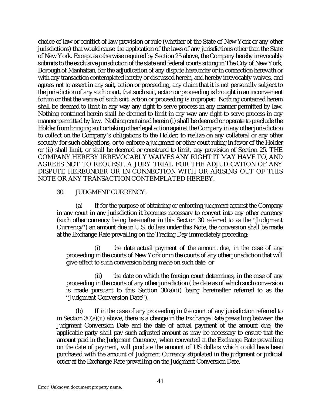 choice of law or conflict of law provision or rule (whether of the State of New York or any other jurisdictions) that would cause the application of the laws of any jurisdictions other than the State of New York. Except as otherwise required by Section 25 above, the Company hereby irrevocably submits to the exclusive jurisdiction of the state and federal courts sitting in The City of New York, Borough of Manhattan, for the adjudication of any dispute hereunder or in connection herewith or with any transaction contemplated hereby or discussed herein, and hereby irrevocably waives, and agrees not to assert in any suit, action or proceeding, any claim that it is not personally subject to the jurisdiction of any such court, that such suit, action or proceeding is brought in an inconvenient forum or that the venue of such suit, action or proceeding is improper. Nothing contained herein shall be deemed to limit in any way any right to serve process in any manner permitted by law. Nothing contained herein shall be deemed to limit in any way any right to serve process in any manner permitted by law. Nothing contained herein (i) shall be deemed or operate to preclude the Holder from bringing suit or taking other legal action against the Company in any other jurisdiction to collect on the Company’s obligations to the Holder, to realize on any collateral or any other security for such obligations, or to enforce a judgment or other court ruling in favor of the Holder or (ii) shall limit, or shall be deemed or construed to limit, any provision of Section 25. THE COMPANY HEREBY IRREVOCABLY WAIVES ANY RIGHT IT MAY HAVE TO, AND AGREES NOT TO REQUEST, A JURY TRIAL FOR THE ADJUDICATION OF ANY DISPUTE HEREUNDER OR IN CONNECTION WITH OR ARISING OUT OF THIS NOTE OR ANY TRANSACTION CONTEMPLATED HEREBY. 30. JUDGMENT CURRENCY. (a) If for the purpose of obtaining or enforcing judgment against the Company in any court in any jurisdiction it becomes necessary to convert into any other currency (such other currency being hereinafter in this Section 30 referred to as the “Judgment Currency”) an amount due in U.S. dollars under this Note, the conversion shall be made at the Exchange Rate prevailing on the Trading Day immediately preceding: (i) the date actual payment of the amount due, in the case of any proceeding in the courts of New York or in the courts of any other jurisdiction that will give effect to such conversion being made on such date: or (ii) the date on which the foreign court determines, in the case of any proceeding in the courts of any other jurisdiction (the date as of which such conversion is made pursuant to this Section 30(a)(ii) being hereinafter referred to as the “Judgment Conversion Date”). (b) If in the case of any proceeding in the court of any jurisdiction referred to in Section 30(a)(ii) above, there is a change in the Exchange Rate prevailing between the Judgment Conversion Date and the date of actual payment of the amount due, the applicable party shall pay such adjusted amount as may be necessary to ensure that the amount paid in the Judgment Currency, when converted at the Exchange Rate prevailing on the date of payment, will produce the amount of US dollars which could have been purchased with the amount of Judgment Currency stipulated in the judgment or judicial order at the Exchange Rate prevailing on the Judgment Conversion Date. 41 Error! Unknown document property name.