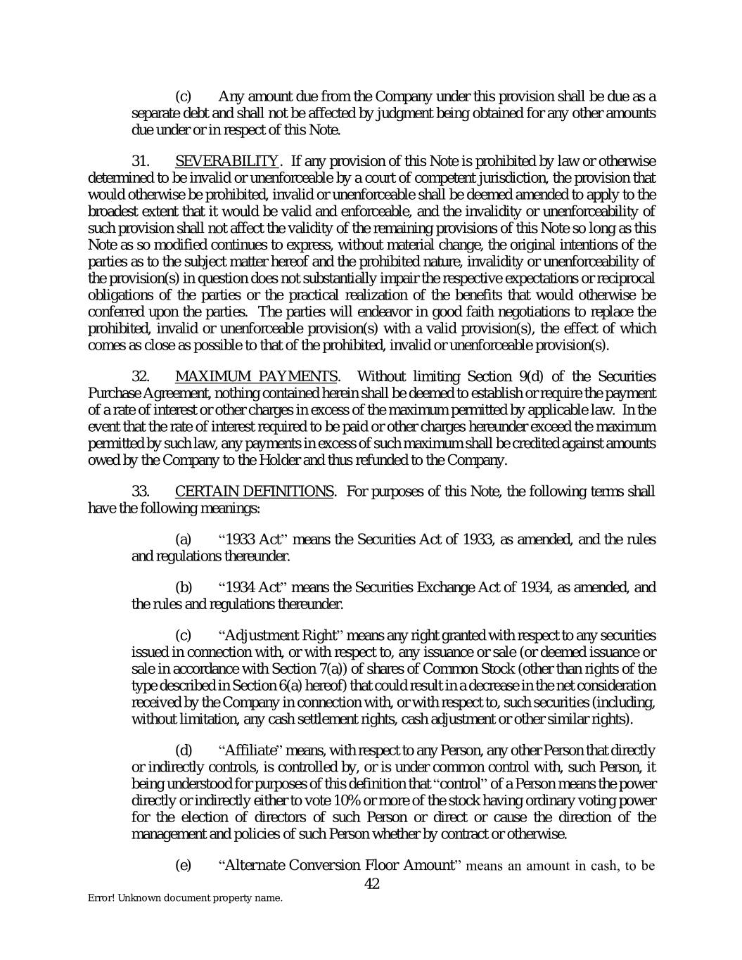 (c) Any amount due from the Company under this provision shall be due as a separate debt and shall not be affected by judgment being obtained for any other amounts due under or in respect of this Note. 31. SEVERABILITY. If any provision of this Note is prohibited by law or otherwise determined to be invalid or unenforceable by a court of competent jurisdiction, the provision that would otherwise be prohibited, invalid or unenforceable shall be deemed amended to apply to the broadest extent that it would be valid and enforceable, and the invalidity or unenforceability of such provision shall not affect the validity of the remaining provisions of this Note so long as this Note as so modified continues to express, without material change, the original intentions of the parties as to the subject matter hereof and the prohibited nature, invalidity or unenforceability of the provision(s) in question does not substantially impair the respective expectations or reciprocal obligations of the parties or the practical realization of the benefits that would otherwise be conferred upon the parties. The parties will endeavor in good faith negotiations to replace the prohibited, invalid or unenforceable provision(s) with a valid provision(s), the effect of which comes as close as possible to that of the prohibited, invalid or unenforceable provision(s). 32. MAXIMUM PAYMENTS. Without limiting Section 9(d) of the Securities Purchase Agreement, nothing contained herein shall be deemed to establish or require the payment of a rate of interest or other charges in excess of the maximum permitted by applicable law. In the event that the rate of interest required to be paid or other charges hereunder exceed the maximum permitted by such law, any payments in excess of such maximum shall be credited against amounts owed by the Company to the Holder and thus refunded to the Company. 33. CERTAIN DEFINITIONS. For purposes of this Note, the following terms shall have the following meanings: (a) “1933 Act” means the Securities Act of 1933, as amended, and the rules and regulations thereunder. (b) “1934 Act” means the Securities Exchange Act of 1934, as amended, and the rules and regulations thereunder. (c) “Adjustment Right” means any right granted with respect to any securities issued in connection with, or with respect to, any issuance or sale (or deemed issuance or sale in accordance with Section 7(a)) of shares of Common Stock (other than rights of the type described in Section 6(a) hereof) that could result in a decrease in the net consideration received by the Company in connection with, or with respect to, such securities (including, without limitation, any cash settlement rights, cash adjustment or other similar rights). (d) “Affiliate” means, with respect to any Person, any other Person that directly or indirectly controls, is controlled by, or is under common control with, such Person, it being understood for purposes of this definition that “control” of a Person means the power directly or indirectly either to vote 10% or more of the stock having ordinary voting power for the election of directors of such Person or direct or cause the direction of the management and policies of such Person whether by contract or otherwise. (e) “Alternate Conversion Floor Amount” means an amount in cash, to be 42 Error! Unknown document property name.