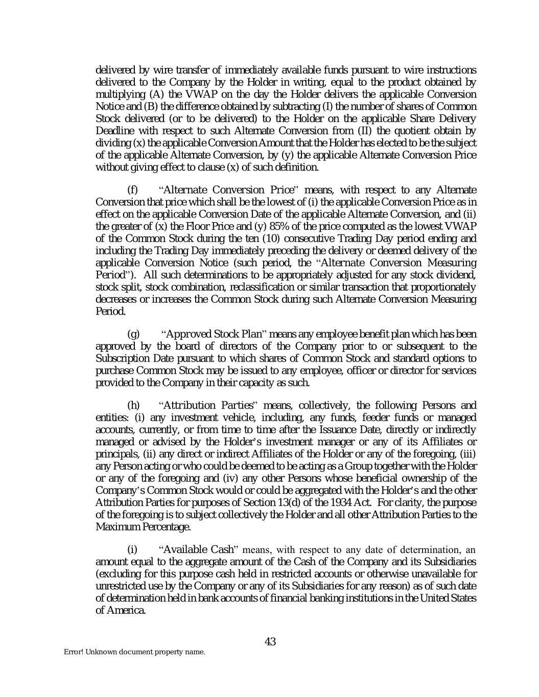 delivered by wire transfer of immediately available funds pursuant to wire instructions delivered to the Company by the Holder in writing, equal to the product obtained by multiplying (A) the VWAP on the day the Holder delivers the applicable Conversion Notice and (B) the difference obtained by subtracting (I) the number of shares of Common Stock delivered (or to be delivered) to the Holder on the applicable Share Delivery Deadline with respect to such Alternate Conversion from (II) the quotient obtain by dividing (x) the applicable Conversion Amount that the Holder has elected to be the subject of the applicable Alternate Conversion, by (y) the applicable Alternate Conversion Price without giving effect to clause (x) of such definition. (f) “Alternate Conversion Price” means, with respect to any Alternate Conversion that price which shall be the lowest of (i) the applicable Conversion Price as in effect on the applicable Conversion Date of the applicable Alternate Conversion, and (ii) the greater of (x) the Floor Price and (y) 85% of the price computed as the lowest VWAP of the Common Stock during the ten (10) consecutive Trading Day period ending and including the Trading Day immediately preceding the delivery or deemed delivery of the applicable Conversion Notice (such period, the “Alternate Conversion Measuring Period”). All such determinations to be appropriately adjusted for any stock dividend, stock split, stock combination, reclassification or similar transaction that proportionately decreases or increases the Common Stock during such Alternate Conversion Measuring Period. (g) “Approved Stock Plan” means any employee benefit plan which has been approved by the board of directors of the Company prior to or subsequent to the Subscription Date pursuant to which shares of Common Stock and standard options to purchase Common Stock may be issued to any employee, officer or director for services provided to the Company in their capacity as such. (h) “Attribution Parties” means, collectively, the following Persons and entities: (i) any investment vehicle, including, any funds, feeder funds or managed accounts, currently, or from time to time after the Issuance Date, directly or indirectly managed or advised by the Holder’s investment manager or any of its Affiliates or principals, (ii) any direct or indirect Affiliates of the Holder or any of the foregoing, (iii) any Person acting or who could be deemed to be acting as a Group together with the Holder or any of the foregoing and (iv) any other Persons whose beneficial ownership of the Company’s Common Stock would or could be aggregated with the Holder’s and the other Attribution Parties for purposes of Section 13(d) of the 1934 Act. For clarity, the purpose of the foregoing is to subject collectively the Holder and all other Attribution Parties to the Maximum Percentage. (i) “Available Cash” means, with respect to any date of determination, an amount equal to the aggregate amount of the Cash of the Company and its Subsidiaries (excluding for this purpose cash held in restricted accounts or otherwise unavailable for unrestricted use by the Company or any of its Subsidiaries for any reason) as of such date of determination held in bank accounts of financial banking institutions in the United States of America. 43 Error! Unknown document property name.