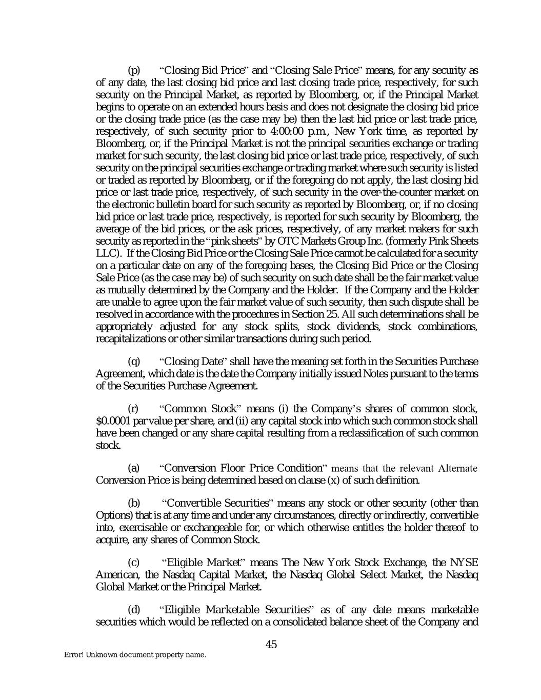 (p) “Closing Bid Price” and “Closing Sale Price” means, for any security as of any date, the last closing bid price and last closing trade price, respectively, for such security on the Principal Market, as reported by Bloomberg, or, if the Principal Market begins to operate on an extended hours basis and does not designate the closing bid price or the closing trade price (as the case may be) then the last bid price or last trade price, respectively, of such security prior to 4:00:00 p.m., New York time, as reported by Bloomberg, or, if the Principal Market is not the principal securities exchange or trading market for such security, the last closing bid price or last trade price, respectively, of such security on the principal securities exchange or trading market where such security is listed or traded as reported by Bloomberg, or if the foregoing do not apply, the last closing bid price or last trade price, respectively, of such security in the over-the-counter market on the electronic bulletin board for such security as reported by Bloomberg, or, if no closing bid price or last trade price, respectively, is reported for such security by Bloomberg, the average of the bid prices, or the ask prices, respectively, of any market makers for such security as reported in the “pink sheets” by OTC Markets Group Inc. (formerly Pink Sheets LLC). If the Closing Bid Price or the Closing Sale Price cannot be calculated for a security on a particular date on any of the foregoing bases, the Closing Bid Price or the Closing Sale Price (as the case may be) of such security on such date shall be the fair market value as mutually determined by the Company and the Holder. If the Company and the Holder are unable to agree upon the fair market value of such security, then such dispute shall be resolved in accordance with the procedures in Section 25. All such determinations shall be appropriately adjusted for any stock splits, stock dividends, stock combinations, recapitalizations or other similar transactions during such period. (q) “Closing Date” shall have the meaning set forth in the Securities Purchase Agreement, which date is the date the Company initially issued Notes pursuant to the terms of the Securities Purchase Agreement. (r) “Common Stock” means (i) the Company’s shares of common stock, $0.0001 par value per share, and (ii) any capital stock into which such common stock shall have been changed or any share capital resulting from a reclassification of such common stock. (a) “Conversion Floor Price Condition” means that the relevant Alternate Conversion Price is being determined based on clause (x) of such definition. (b) “Convertible Securities” means any stock or other security (other than Options) that is at any time and under any circumstances, directly or indirectly, convertible into, exercisable or exchangeable for, or which otherwise entitles the holder thereof to acquire, any shares of Common Stock. (c) “Eligible Market” means The New York Stock Exchange, the NYSE American, the Nasdaq Capital Market, the Nasdaq Global Select Market, the Nasdaq Global Market or the Principal Market. (d) “Eligible Marketable Securities” as of any date means marketable securities which would be reflected on a consolidated balance sheet of the Company and 45 Error! Unknown document property name.