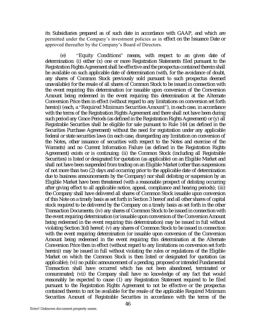 its Subsidiaries prepared as of such date in accordance with GAAP, and which are permitted under the Company’s investment policies as in effect on the Issuance Date or approved thereafter by the Company’s Board of Directors. (e) “Equity Conditions” means, with respect to an given date of determination: (i) either (x) one or more Registration Statements filed pursuant to the Registration Rights Agreement shall be effective and the prospectus contained therein shall be available on such applicable date of determination (with, for the avoidance of doubt, any shares of Common Stock previously sold pursuant to such prospectus deemed unavailable) for the resale of all shares of Common Stock to be issued in connection with the event requiring this determination (or issuable upon conversion of the Conversion Amount being redeemed in the event requiring this determination at the Alternate Conversion Price then in effect (without regard to any limitations on conversion set forth herein)) (each, a “Required Minimum Securities Amount”), in each case, in accordance with the terms of the Registration Rights Agreement and there shall not have been during such period any Grace Periods (as defined in the Registration Rights Agreement) or (y) all Registrable Securities shall be eligible for sale pursuant to Rule 144 (as defined in the Securities Purchase Agreement) without the need for registration under any applicable federal or state securities laws (in each case, disregarding any limitation on conversion of the Notes, other issuance of securities with respect to the Notes and exercise of the Warrants) and no Current Information Failure (as defined in the Registration Rights Agreement) exists or is continuing; (ii) the Common Stock (including all Registrable Securities) is listed or designated for quotation (as applicable) on an Eligible Market and shall not have been suspended from trading on an Eligible Market (other than suspensions of not more than two (2) days and occurring prior to the applicable date of determination due to business announcements by the Company) nor shall delisting or suspension by an Eligible Market have been threatened (with a reasonable prospect of delisting occurring after giving effect to all applicable notice, appeal, compliance and hearing periods); (iii) the Company shall have delivered all shares of Common Stock issuable upon conversion of this Note on a timely basis as set forth in Section 3 hereof and all other shares of capital stock required to be delivered by the Company on a timely basis as set forth in the other Transaction Documents; (iv) any shares of Common Stock to be issued in connection with the event requiring determination (or issuable upon conversion of the Conversion Amount being redeemed in the event requiring this determination) may be issued in full without violating Section 3(d) hereof; (v) any shares of Common Stock to be issued in connection with the event requiring determination (or issuable upon conversion of the Conversion Amount being redeemed in the event requiring this determination at the Alternate Conversion Price then in effect (without regard to any limitations on conversion set forth herein)) may be issued in full without violating the rules or regulations of the Eligible Market on which the Common Stock is then listed or designated for quotation (as applicable); (vi) no public announcement of a pending, proposed or intended Fundamental Transaction shall have occurred which has not been abandoned, terminated or consummated; (vii) the Company shall have no knowledge of any fact that would reasonably be expected to cause (1) any Registration Statement required to be filed pursuant to the Registration Rights Agreement to not be effective or the prospectus contained therein to not be available for the resale of the applicable Required Minimum Securities Amount of Registrable Securities in accordance with the terms of the 46 Error! Unknown document property name.