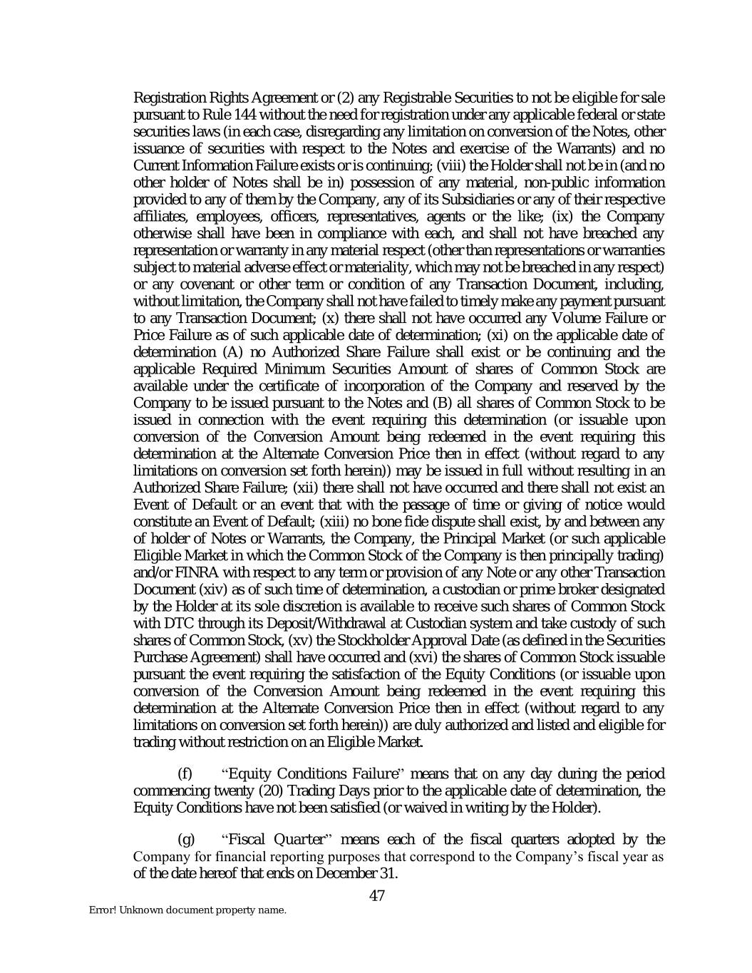 Registration Rights Agreement or (2) any Registrable Securities to not be eligible for sale pursuant to Rule 144 without the need for registration under any applicable federal or state securities laws (in each case, disregarding any limitation on conversion of the Notes, other issuance of securities with respect to the Notes and exercise of the Warrants) and no Current Information Failure exists or is continuing; (viii) the Holder shall not be in (and no other holder of Notes shall be in) possession of any material, non-public information provided to any of them by the Company, any of its Subsidiaries or any of their respective affiliates, employees, officers, representatives, agents or the like; (ix) the Company otherwise shall have been in compliance with each, and shall not have breached any representation or warranty in any material respect (other than representations or warranties subject to material adverse effect or materiality, which may not be breached in any respect) or any covenant or other term or condition of any Transaction Document, including, without limitation, the Company shall not have failed to timely make any payment pursuant to any Transaction Document; (x) there shall not have occurred any Volume Failure or Price Failure as of such applicable date of determination; (xi) on the applicable date of determination (A) no Authorized Share Failure shall exist or be continuing and the applicable Required Minimum Securities Amount of shares of Common Stock are available under the certificate of incorporation of the Company and reserved by the Company to be issued pursuant to the Notes and (B) all shares of Common Stock to be issued in connection with the event requiring this determination (or issuable upon conversion of the Conversion Amount being redeemed in the event requiring this determination at the Alternate Conversion Price then in effect (without regard to any limitations on conversion set forth herein)) may be issued in full without resulting in an Authorized Share Failure; (xii) there shall not have occurred and there shall not exist an Event of Default or an event that with the passage of time or giving of notice would constitute an Event of Default; (xiii) no bone fide dispute shall exist, by and between any of holder of Notes or Warrants, the Company, the Principal Market (or such applicable Eligible Market in which the Common Stock of the Company is then principally trading) and/or FINRA with respect to any term or provision of any Note or any other Transaction Document (xiv) as of such time of determination, a custodian or prime broker designated by the Holder at its sole discretion is available to receive such shares of Common Stock with DTC through its Deposit/Withdrawal at Custodian system and take custody of such shares of Common Stock, (xv) the Stockholder Approval Date (as defined in the Securities Purchase Agreement) shall have occurred and (xvi) the shares of Common Stock issuable pursuant the event requiring the satisfaction of the Equity Conditions (or issuable upon conversion of the Conversion Amount being redeemed in the event requiring this determination at the Alternate Conversion Price then in effect (without regard to any limitations on conversion set forth herein)) are duly authorized and listed and eligible for trading without restriction on an Eligible Market. (f) “Equity Conditions Failure” means that on any day during the period commencing twenty (20) Trading Days prior to the applicable date of determination, the Equity Conditions have not been satisfied (or waived in writing by the Holder). (g) “Fiscal Quarter” means each of the fiscal quarters adopted by the Company for financial reporting purposes that correspond to the Company’s fiscal year as of the date hereof that ends on December 31. 47 Error! Unknown document property name.