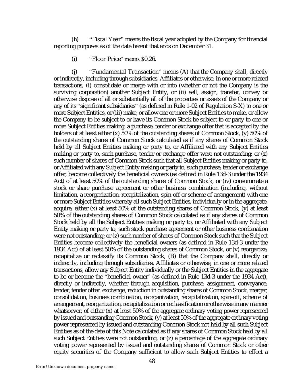 (h) “Fiscal Year” means the fiscal year adopted by the Company for financial reporting purposes as of the date hereof that ends on December 31. (i) “Floor Price” means $0.26. (j) “Fundamental Transaction” means (A) that the Company shall, directly or indirectly, including through subsidiaries, Affiliates or otherwise, in one or more related transactions, (i) consolidate or merge with or into (whether or not the Company is the surviving corporation) another Subject Entity, or (ii) sell, assign, transfer, convey or otherwise dispose of all or substantially all of the properties or assets of the Company or any of its “significant subsidiaries” (as defined in Rule 1-02 of Regulation S-X) to one or more Subject Entities, or (iii) make, or allow one or more Subject Entities to make, or allow the Company to be subject to or have its Common Stock be subject to or party to one or more Subject Entities making, a purchase, tender or exchange offer that is accepted by the holders of at least either (x) 50% of the outstanding shares of Common Stock, (y) 50% of the outstanding shares of Common Stock calculated as if any shares of Common Stock held by all Subject Entities making or party to, or Affiliated with any Subject Entities making or party to, such purchase, tender or exchange offer were not outstanding; or (z) such number of shares of Common Stock such that all Subject Entities making or party to, or Affiliated with any Subject Entity making or party to, such purchase, tender or exchange offer, become collectively the beneficial owners (as defined in Rule 13d-3 under the 1934 Act) of at least 50% of the outstanding shares of Common Stock, or (iv) consummate a stock or share purchase agreement or other business combination (including, without limitation, a reorganization, recapitalization, spin-off or scheme of arrangement) with one or more Subject Entities whereby all such Subject Entities, individually or in the aggregate, acquire, either (x) at least 50% of the outstanding shares of Common Stock, (y) at least 50% of the outstanding shares of Common Stock calculated as if any shares of Common Stock held by all the Subject Entities making or party to, or Affiliated with any Subject Entity making or party to, such stock purchase agreement or other business combination were not outstanding; or (z) such number of shares of Common Stock such that the Subject Entities become collectively the beneficial owners (as defined in Rule 13d-3 under the 1934 Act) of at least 50% of the outstanding shares of Common Stock, or (v) reorganize, recapitalize or reclassify its Common Stock, (B) that the Company shall, directly or indirectly, including through subsidiaries, Affiliates or otherwise, in one or more related transactions, allow any Subject Entity individually or the Subject Entities in the aggregate to be or become the “beneficial owner” (as defined in Rule 13d-3 under the 1934 Act), directly or indirectly, whether through acquisition, purchase, assignment, conveyance, tender, tender offer, exchange, reduction in outstanding shares of Common Stock, merger, consolidation, business combination, reorganization, recapitalization, spin-off, scheme of arrangement, reorganization, recapitalization or reclassification or otherwise in any manner whatsoever, of either (x) at least 50% of the aggregate ordinary voting power represented by issued and outstanding Common Stock, (y) at least 50% of the aggregate ordinary voting power represented by issued and outstanding Common Stock not held by all such Subject Entities as of the date of this Note calculated as if any shares of Common Stock held by all such Subject Entities were not outstanding, or (z) a percentage of the aggregate ordinary voting power represented by issued and outstanding shares of Common Stock or other equity securities of the Company sufficient to allow such Subject Entities to effect a 48 Error! Unknown document property name.