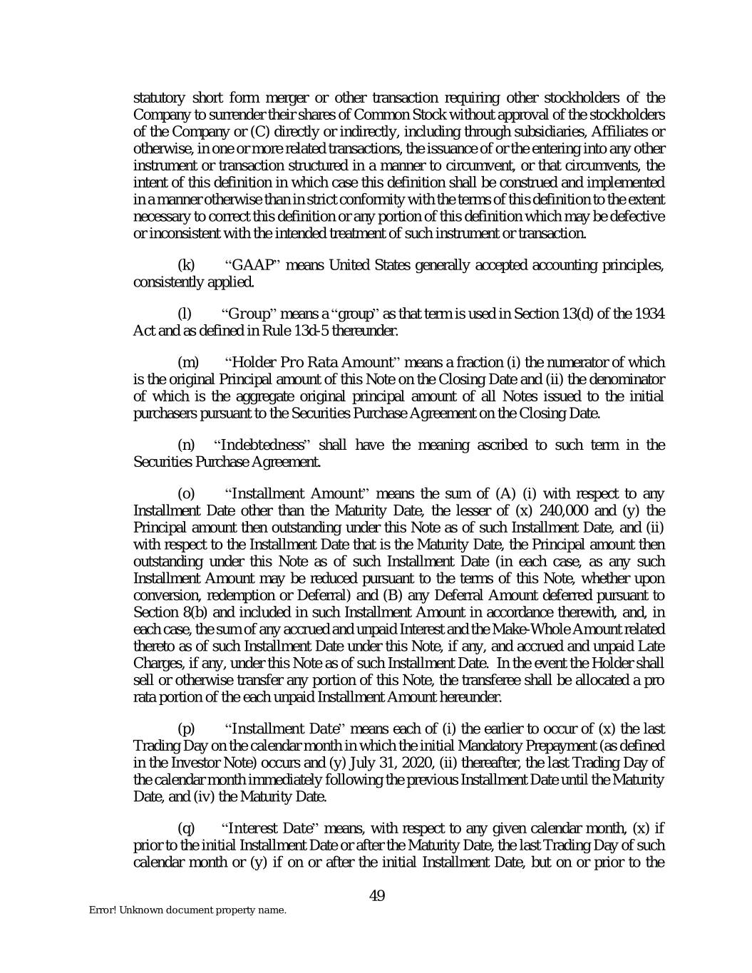 statutory short form merger or other transaction requiring other stockholders of the Company to surrender their shares of Common Stock without approval of the stockholders of the Company or (C) directly or indirectly, including through subsidiaries, Affiliates or otherwise, in one or more related transactions, the issuance of or the entering into any other instrument or transaction structured in a manner to circumvent, or that circumvents, the intent of this definition in which case this definition shall be construed and implemented in a manner otherwise than in strict conformity with the terms of this definition to the extent necessary to correct this definition or any portion of this definition which may be defective or inconsistent with the intended treatment of such instrument or transaction. (k) “GAAP” means United States generally accepted accounting principles, consistently applied. (l) “Group” means a “group” as that term is used in Section 13(d) of the 1934 Act and as defined in Rule 13d-5 thereunder. (m) “Holder Pro Rata Amount” means a fraction (i) the numerator of which is the original Principal amount of this Note on the Closing Date and (ii) the denominator of which is the aggregate original principal amount of all Notes issued to the initial purchasers pursuant to the Securities Purchase Agreement on the Closing Date. (n) “Indebtedness” shall have the meaning ascribed to such term in the Securities Purchase Agreement. (o) “Installment Amount” means the sum of (A) (i) with respect to any Installment Date other than the Maturity Date, the lesser of (x) 240,000 and (y) the Principal amount then outstanding under this Note as of such Installment Date, and (ii) with respect to the Installment Date that is the Maturity Date, the Principal amount then outstanding under this Note as of such Installment Date (in each case, as any such Installment Amount may be reduced pursuant to the terms of this Note, whether upon conversion, redemption or Deferral) and (B) any Deferral Amount deferred pursuant to Section 8(b) and included in such Installment Amount in accordance therewith, and, in each case, the sum of any accrued and unpaid Interest and the Make-Whole Amount related thereto as of such Installment Date under this Note, if any, and accrued and unpaid Late Charges, if any, under this Note as of such Installment Date. In the event the Holder shall sell or otherwise transfer any portion of this Note, the transferee shall be allocated a pro rata portion of the each unpaid Installment Amount hereunder. (p) “Installment Date” means each of (i) the earlier to occur of (x) the last Trading Day on the calendar month in which the initial Mandatory Prepayment (as defined in the Investor Note) occurs and (y) July 31, 2020, (ii) thereafter, the last Trading Day of the calendar month immediately following the previous Installment Date until the Maturity Date, and (iv) the Maturity Date. (q) “Interest Date” means, with respect to any given calendar month, (x) if prior to the initial Installment Date or after the Maturity Date, the last Trading Day of such calendar month or (y) if on or after the initial Installment Date, but on or prior to the 49 Error! Unknown document property name.