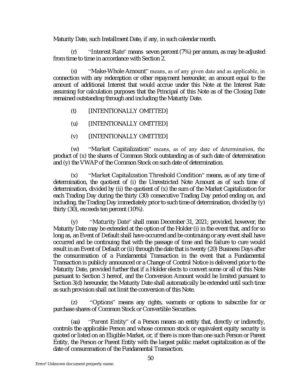 Maturity Date, such Installment Date, if any, in such calendar month. (r) “Interest Rate” means seven percent (7%) per annum, as may be adjusted from time to time in accordance with Section 2. (s) “Make-Whole Amount” means, as of any given date and as applicable, in connection with any redemption or other repayment hereunder, an amount equal to the amount of additional Interest that would accrue under this Note at the Interest Rate assuming for calculation purposes that the Principal of this Note as of the Closing Date remained outstanding through and including the Maturity Date. (t) [INTENTIONALLY OMITTED] (u) [INTENTIONALLY OMITTED] (v) [INTENTIONALLY OMITTED] (w) “Market Capitalization” means, as of any date of determination, the product of (x) the shares of Common Stock outstanding as of such date of determination and (y) the VWAP of the Common Stock on such date of determination. (x) “Market Capitalization Threshold Condition” means, as of any time of determination, the quotient of (i) the Unrestricted Note Amount as of such time of determination, divided by (ii) the quotient of (x) the sum of the Market Capitalization for each Trading Day during the thirty (30) consecutive Trading Day period ending on, and including, the Trading Day immediately prior to such time of determination, divided by (y) thirty (30), exceeds ten percent (10%). (y) “Maturity Date” shall mean December 31, 2021; provided, however, the Maturity Date may be extended at the option of the Holder (i) in the event that, and for so long as, an Event of Default shall have occurred and be continuing or any event shall have occurred and be continuing that with the passage of time and the failure to cure would result in an Event of Default or (ii) through the date that is twenty (20) Business Days after the consummation of a Fundamental Transaction in the event that a Fundamental Transaction is publicly announced or a Change of Control Notice is delivered prior to the Maturity Date, provided further that if a Holder elects to convert some or all of this Note pursuant to Section 3 hereof, and the Conversion Amount would be limited pursuant to Section 3(d) hereunder, the Maturity Date shall automatically be extended until such time as such provision shall not limit the conversion of this Note. (z) “Options” means any rights, warrants or options to subscribe for or purchase shares of Common Stock or Convertible Securities. (aa) “Parent Entity” of a Person means an entity that, directly or indirectly, controls the applicable Person and whose common stock or equivalent equity security is quoted or listed on an Eligible Market, or, if there is more than one such Person or Parent Entity, the Person or Parent Entity with the largest public market capitalization as of the date of consummation of the Fundamental Transaction. 50 Error! Unknown document property name.